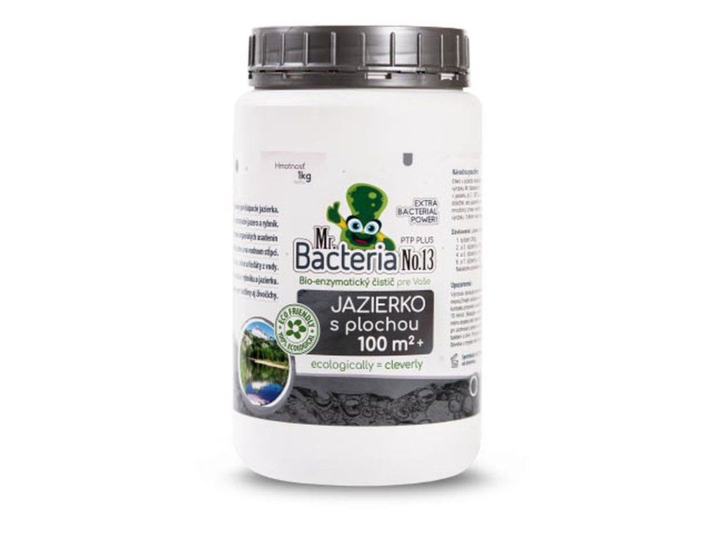 Prípravok Mr. Bacteria No. 13 je zmes bakteriálnych spór, enzýmov a živín nutných pre činnosť mikroorganizmov. Účelom používania prípravku Mr. Bacteria No. 13 je odstránenie organického bahna, siníc a zvýšenie obsahu kyslíka vo vodnom stĺpci Vášho rybníku alebo jazera. Pôsobením prípravku v jazere a rybníku je rozklad a odstránenie organických usadenín a organického bahna na dne i vo vodnom stĺpci jazierka alebo rybníku, pomocou vysoko mobilných prírodných nemodifikovaných aeróbnych baktérií a fakultatívnych anaeróbnych baktérií s pozitívnou chemotaxou (vedia rozpoznať typ chemického odpadu a plávať k nemu). Zároveň dochádza k výraznému zníženiu fosforu a chlorofylu A, ktorý je meradlom koncentrácie rias (likviduje látky podporujúce rast rias a tvorbu siníc), fosfátov a zakalenia vo vodnom stĺpci. Odstránenie fosfátov má za následok odstránenie siníc a dochádza k zvýšeniu obsahu kyslíka vo vode. Pri pravidelnom používaní prípravku Mr. Bacteria No. 13 dochádza k reprodukcii baktérií, č o má za následok nepretržité čistenie jazier a rybníkov. Dochádza k odstráneniu organického bahna a nie je potrebné drahé vybagrovanie a odvoz bahna na skládku zo dna rybníka.