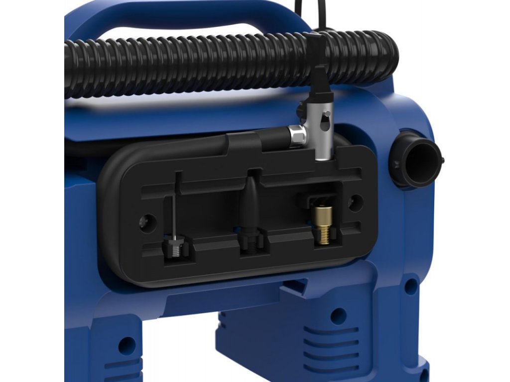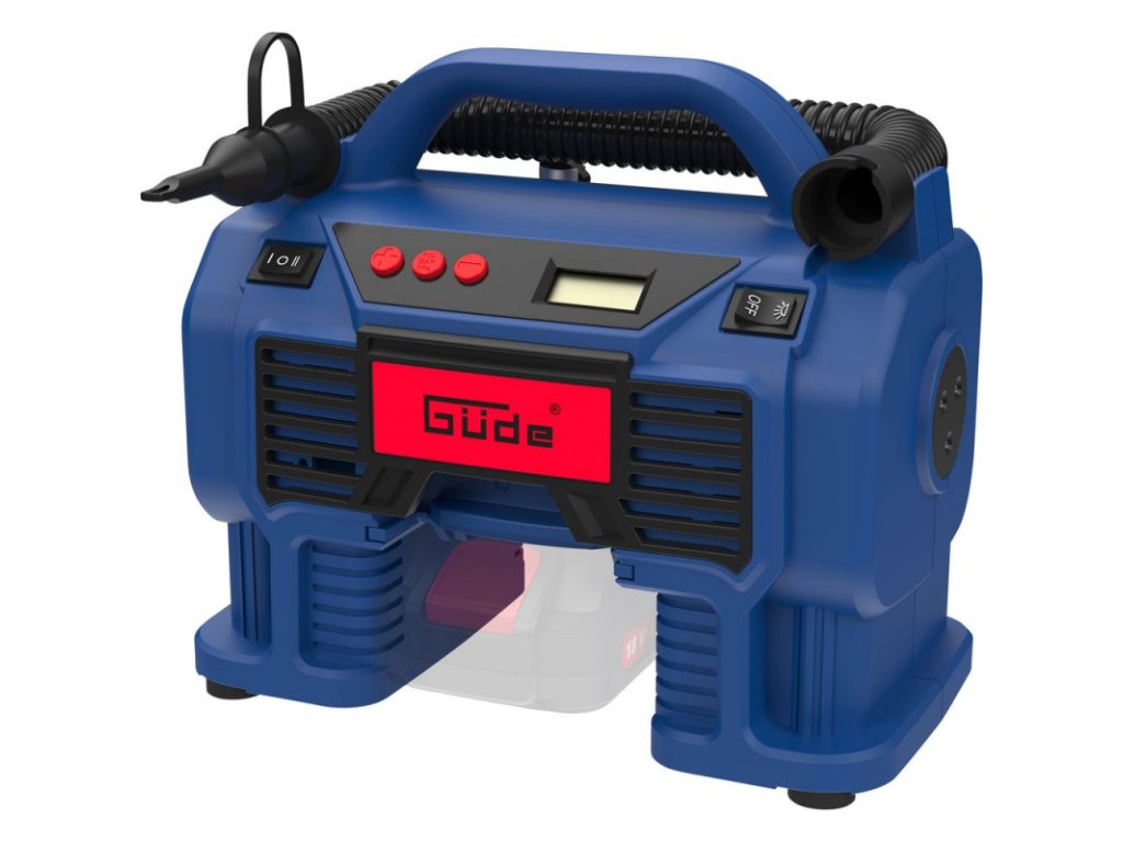 Akumulátorový kompresor zo série akumulátorového náradia 18V E3 na plnenie pneumatík bicyklov, pneumatík osobných automobilov alebo lôpt, pumpa na hustenie a odvzdušnenie nafukovacích matracov alebo člnov. Digitálny manometer s automatickým vypnutím, pripojenie zapaľovača cigariet 12 V. LED pracovný svetlomet. Praktické držadlo na prenášanie. Univerzálna dýza, ihla na hustenie lôpt, adaptér na bicykel. Bez akumulátora a nabíjačky.