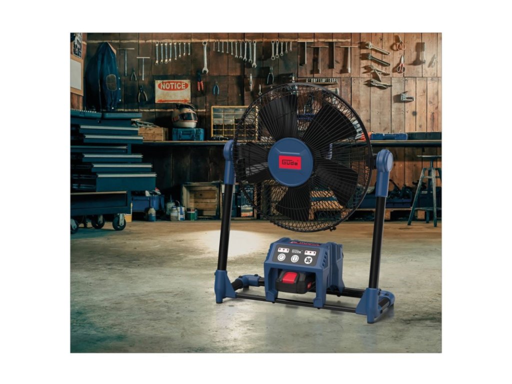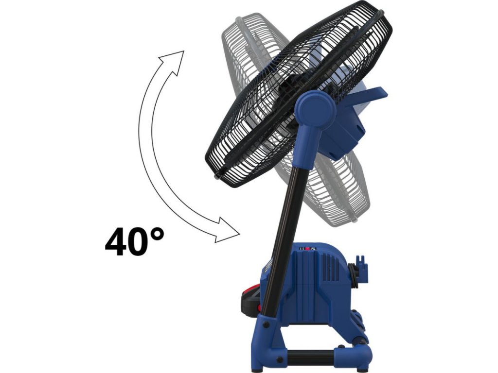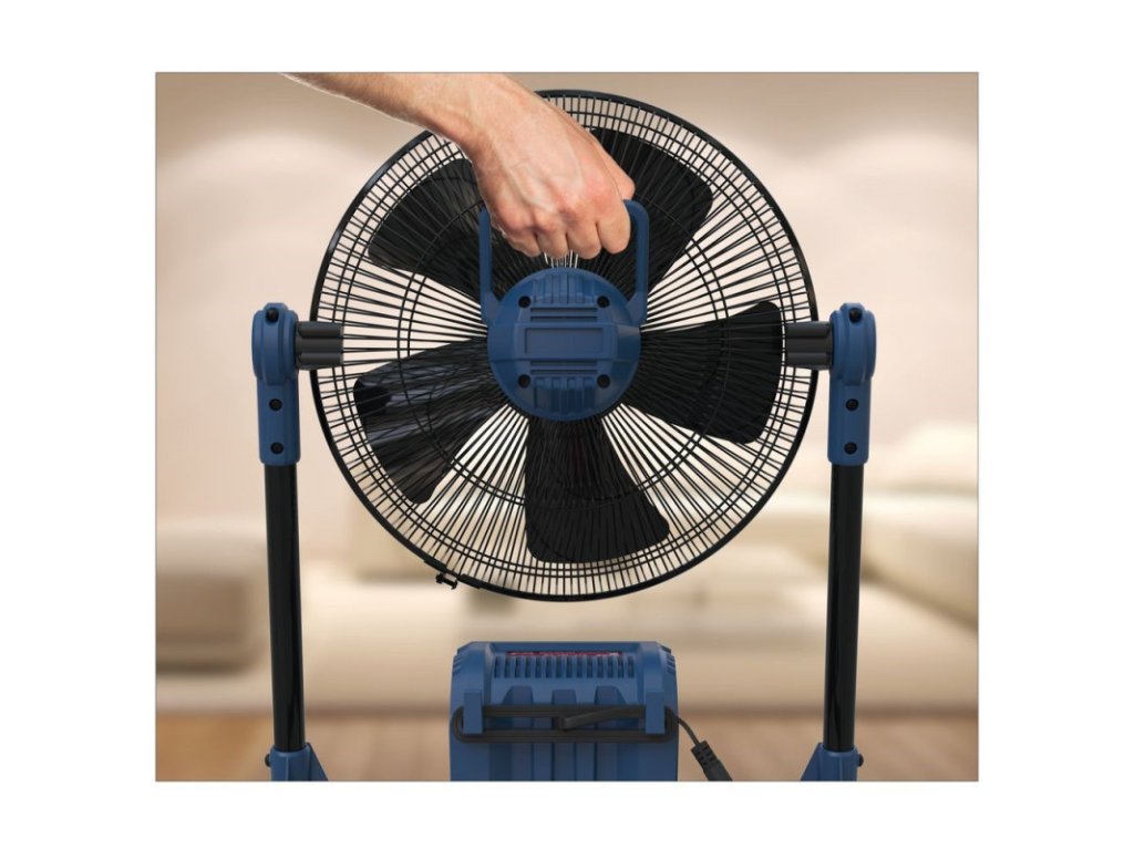 Akumulátorový ventilátor zo série akumulátorového náradia 18V E3 na použitie v domácnosti a dielni. Nastaviteľné trojrýchlostné prúdenie vzduchu, nastaviteľná doba prevádzky (nepretržitá prevádzka alebo časovač na 1, 2 alebo 4 hodiny). Maximálna rýchlosť prúdenia vzduchu 360 m/min. Ventilátor sklopný v rozsahu 40°. Prevádzka je možná na akumulátor alebo so sieťovým adaptérom 230 V. Gumové nožičky. Vrátane akumulátora 2,0 Ah a nabíjačky.
