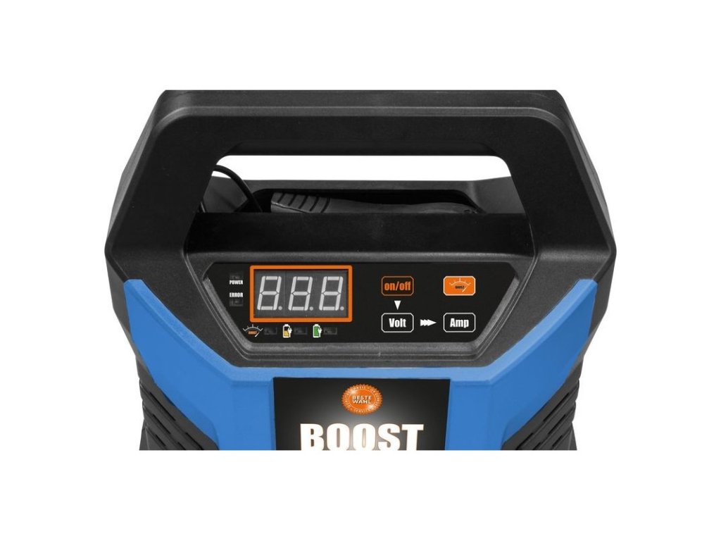 Invertorová technológia pre efektívne využitie energie. Procesorom riadená technológia inteligentného nabíjania, šesťstupňový proces nabíjania šetriaci batériu. Pre všetky bežné 12 V batérie. Funkcia BOOST 15 A-300 sekúnd na pomoc pri štartovaní. Možnosť priameho nabíjania batérie pripojenej vo vozidle. Automatické vypnutie nabíjania / prechod do režimu udržiavacieho nabíjania. Regulácia teploty počas nabíjania, ochrana proti prepólovaniu a skratu, LED displej, plne izolované svorky batérie. Pripojenie zapaľovača cigariet 12 V. Vhodné pre batérie PB - olovená batéria (aj MF), GEL - gélová batéria, AGM - prietoková batéria (štart-stop automat.), WET - mokrá batéria.