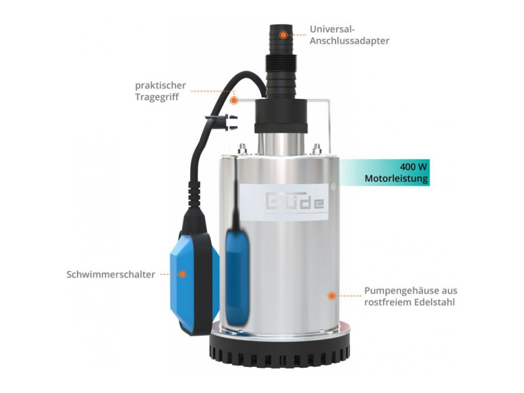 Ponorné čerpadlo na vodu s plytkým saním. Variabilne nastaviteľný plavákový spínač pre automatické zapnutie čerpadla. Plášť z nehrdzavejúcej ocele, obežné koleso z norylu. Tepelná ochrana chráni čerpadlo pred prehriatím, rukoväť na prenášanie, 10 m prípojný kábel. Na odvodnenie pivníc pri zaplavení, pri presakovaní podzemnej vody, na zavlažovanie záhrad, na čerpanie z nádrží a cisterien.