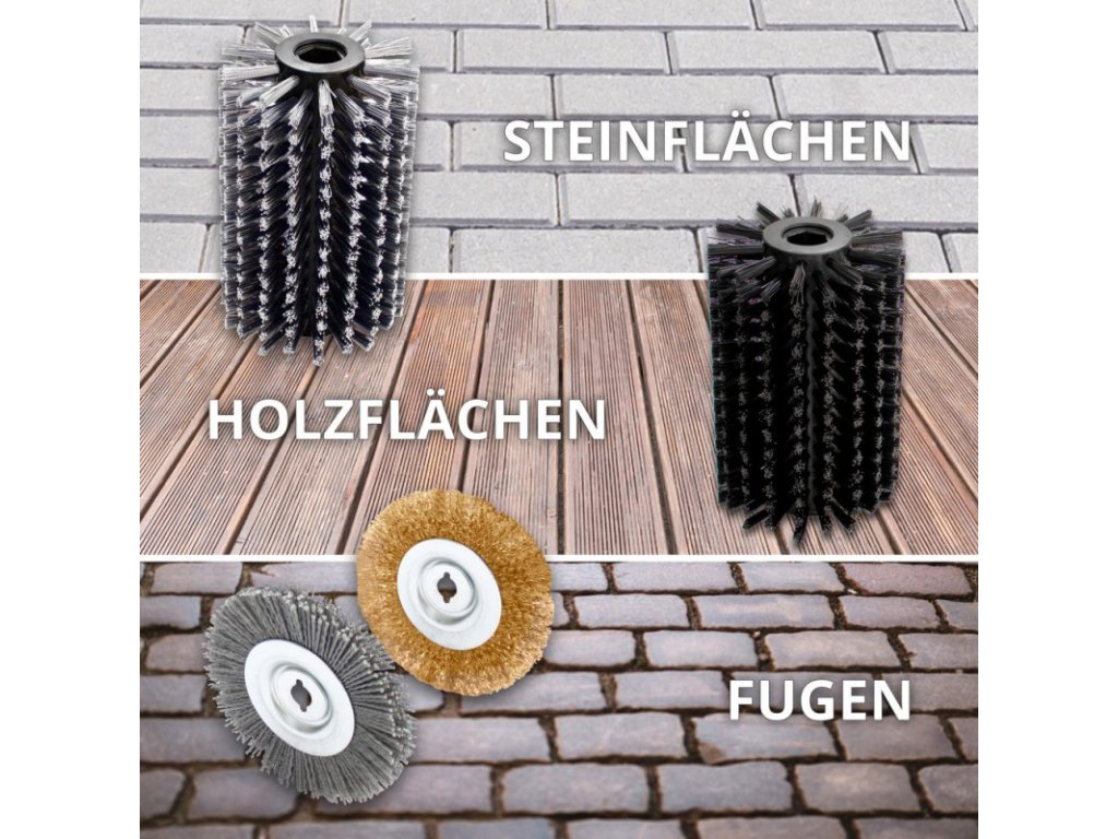 Elektrická čistiaca kefa na čistenie kamenných a drevených povrchov, s násadami na čistenie škár. S ergonomicky tvarovanou rukoväťou a plynulou reguláciou otáčok je práca veľmi jednoduchá. Jednoduchá výmena všetkých násad bez použitia náradia, teleskopická tyč s možnosťou nastavenia výšky od 980 do 1280 mm. Ochrana proti striekaniu, bezpečnostný vypínač, prídavná rukoväť prestaviteľná o 180°, mäkká rukoväť, vhodná pre ľavákov aj pravákov, odľahčenie ťahu kábla. Na čistenie a odstraňovanie nečistôt na rôznych povrchoch, napríklad na chodníkoch, terasových platniach alebo okrajoch trávnikov. Násady: 1 x široká nylonová kefa, tvrdá; 1 x široká nylonová kefa, mäkká; 1 x kovová kefa z nehrdzavejúceho materiálu, úzka; 1 x nylonová kefa, úzka.