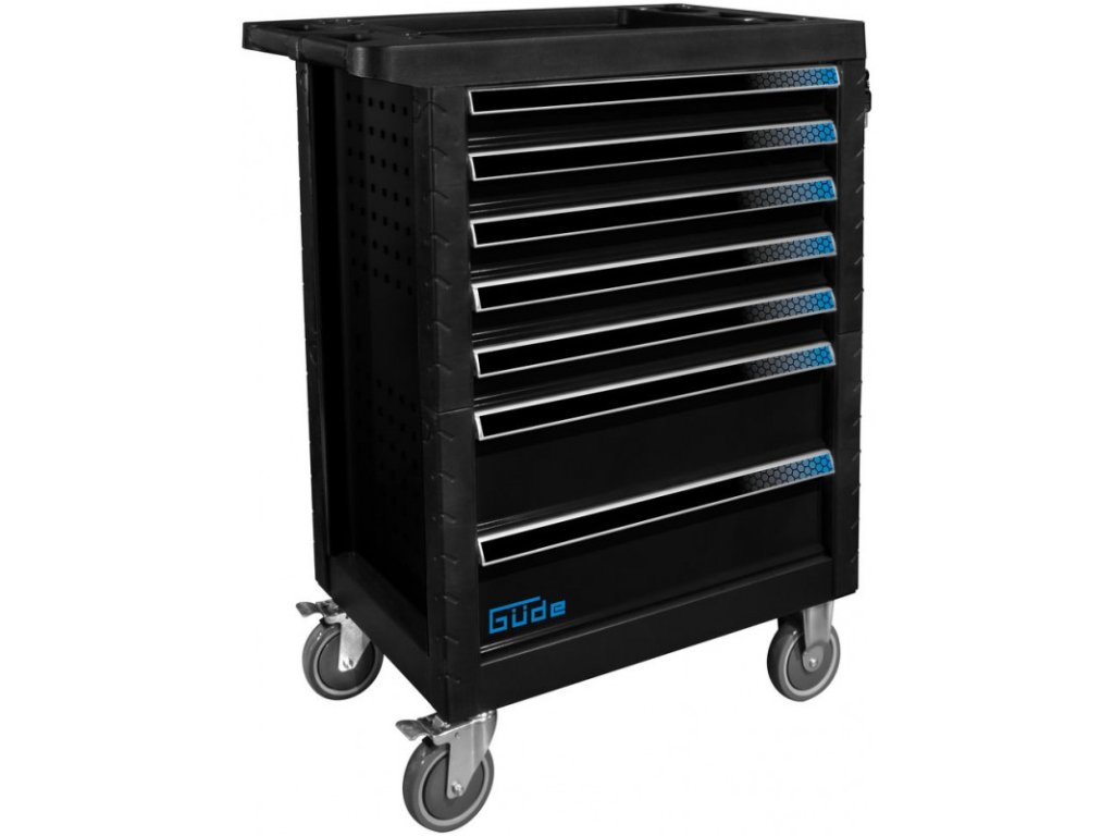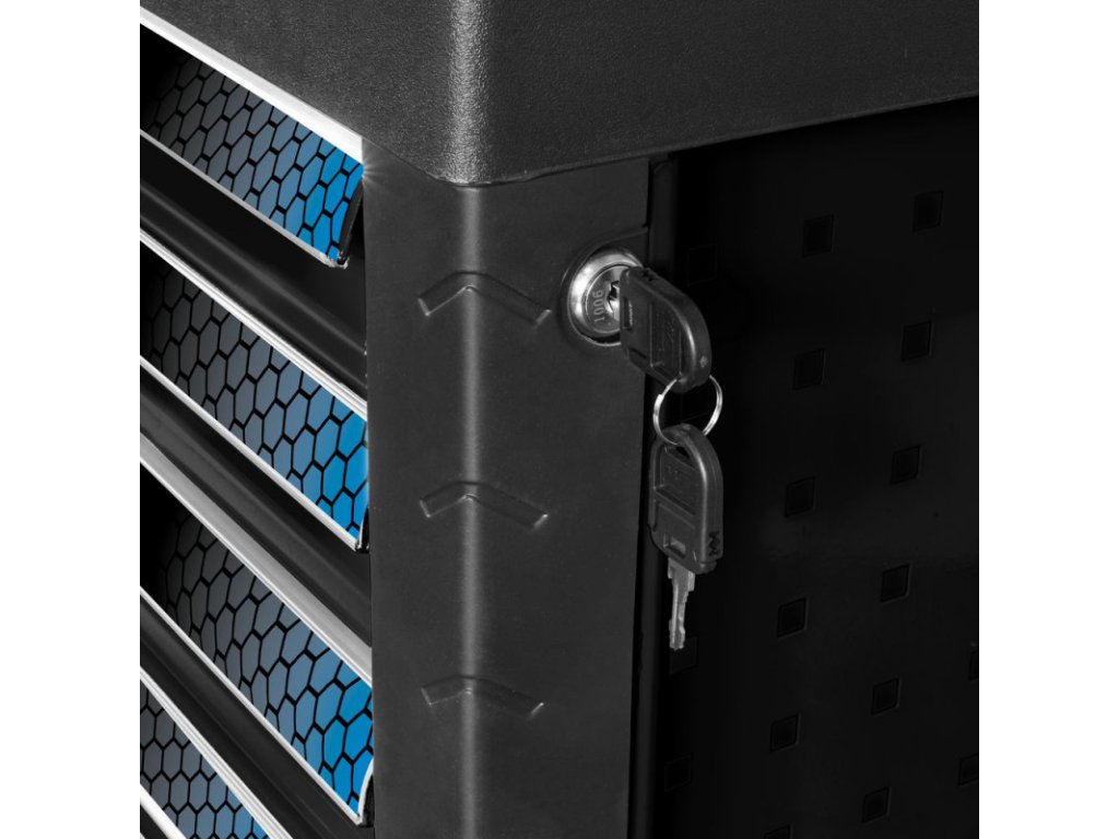 Pojazdný vozík s náradím do autodielne alebo garáže domáceho majstra. Pracovná plocha s integrovanými odkladacími priehradkami. Dvojstupňový systém uzamykania (centrálne uzamykanie s dvomi kľúčmi a samostatným uzamykaním zásuviek). Popisovateľné zásuvky s plným vysúvaním, uložené na guľôčkových ložiskách, s poistkou proti vytiahnutiu zásuviek. Normované dierovanie bočných stien umožňuje dodatočné možnosti rozšírenia na umiestnenie príslušenstva, ako napríklad dodatočných držiakov náradia, ochrana hrán, oceľový plech natretý práškovou farbou, pogumovaná rukoväť. Štyri veľké kolesá s ľahkým chodom (dve ovládateľné s brzdou).