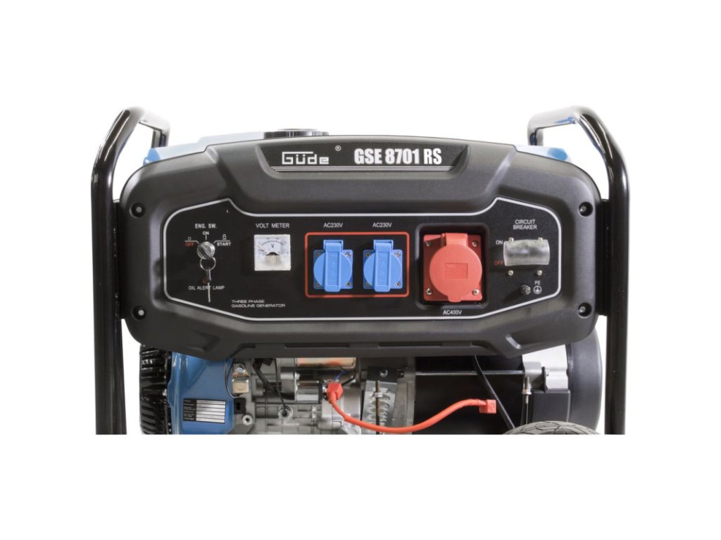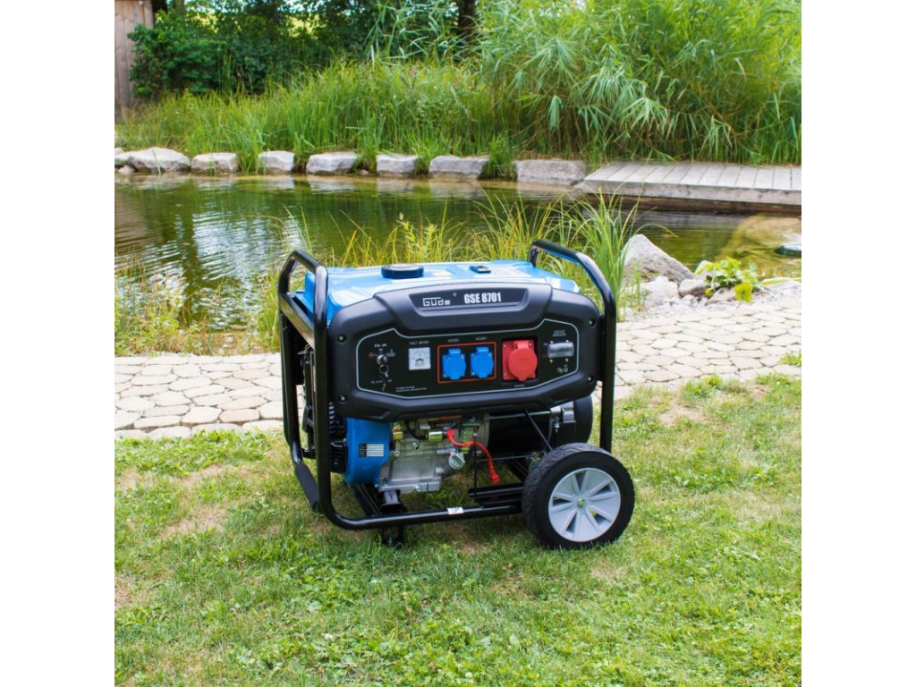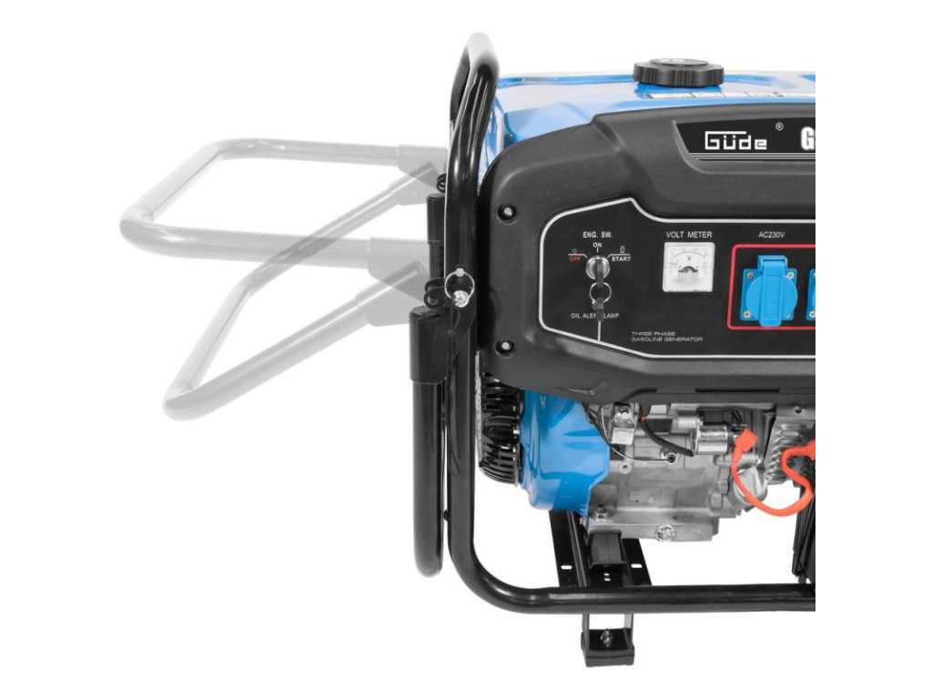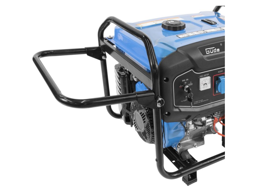 Elektrocentrála so 4-taktným synchrónnym generátorom, AVR (automatická regulácia napätia pre stabilný výkon), 2 x Schuko 230 V / 50 Hz, 1 x 400 V / 50 HZ, skladacia transportná rukoväť pre úsporu miesta pri skladovaní, podvozok s veľkými kolesami pre ľahké premiestňovanie, reverzný štartér. Ochrana proti preťaženiu, ochrana pri nízkej hladine oleja, voltmeter. Elektrický štart kľúčom zapaľovania pomocou 12 V batérie. Dodávané bez batérie pre elektrický štart. Tento generátor nie je vhodný na prevádzku elektronicky citlivých prístrojov, ako sú notebooky, smartfóny alebo zvukové systémy.