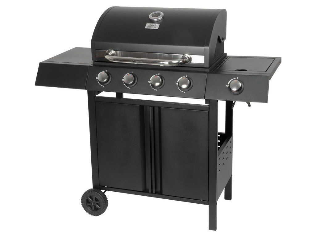 Plynový 4+1 horákový gril je ideálny na rýchlu prípravu jedál. Súčasťou je tiež jeden samostatný horák na pravej strane, pre potrebu jednoduchého varenia vonku. Na ľavej strane sa nachádza menší odkladací priestor, kde si môžeme uložiť grilovacie kliešte a pod. Hlavná grilovacia časť sa nachádza pod vrchným kovovým krytom. Varná mriežka je vyrobená zo smaltovanej ocele. Výhodou grilu je zabudovaný ukazovateľ teploty z nehrdzavejúcej ocele, vďaka čomu nemusíte jedlo neustále kontrolovať. Pod grilovacou časťou sa tiež nachádza odkladací priestor, ktorý môžete využiť na umiestnene plynovej fľaše. Pre funkčnosť grilu sa používa štandardná plynová fľaša s hmotnosťou náplne do 11 kg. Celý povrch je pokrytý krásnou práškovou čiernou farbou. Z hľadiska čistenia na tomto grile oceníte, že sa mastnota po grilovaní odstraňuje veľmi jednoducho. Rozmery grilu sú 120 x 53 x 110 cm. Hmotnosť je 28,5 kg, teda nie je ideálny na každodenné prenášanie. V prípade potreba je však podstava vybavená dvomi kolieskami, ktoré vám nutný prenos uľahčia.