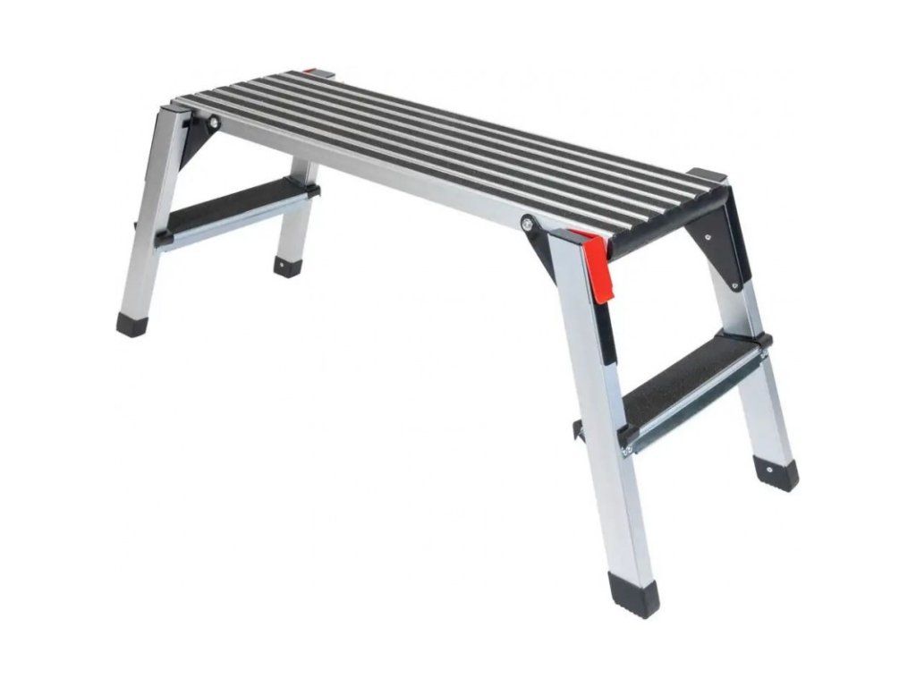 Praktická, skladacia pracovná plošina s veľkou plochou na všetky druhy práce. Či už na stavbe alebo v domácnosti, táto ľahká hliníková plošina je nenahraditeľným pomocníkom pri montáži, renovácii alebo dekorovaní. Plošina a schodíky s protišmykovou vrstvou pre bezpečné státie pri práci. Extra dlhá plocha pre pohodlnú prácu. Bezpečnostný držiak na zablokovanie v rozloženom stave. Vďaka jednoduchému skladaciemu mechanizmu sa dá zložiť, čím sa šetrí miesto. Gumené protišmykové nožičky.