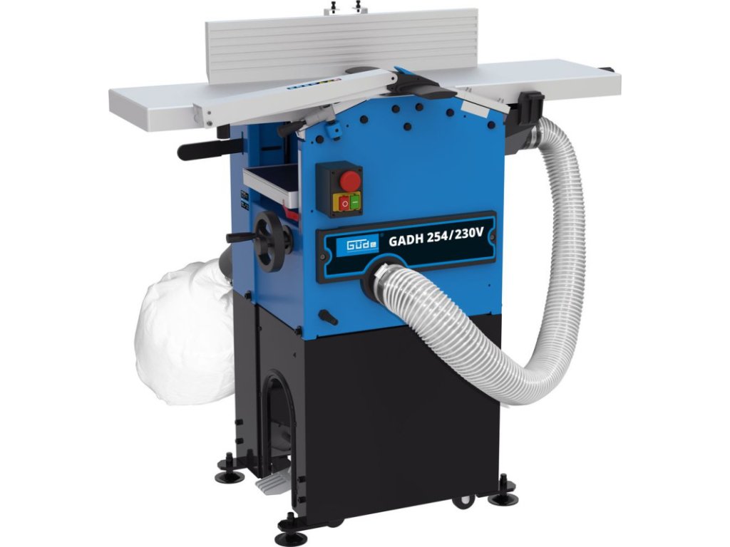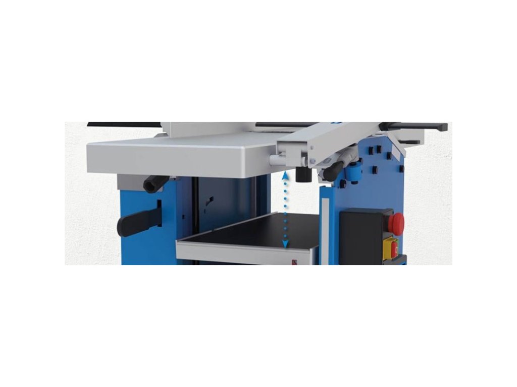 Kombinovaný drevoobrábací stroj (hobľovačka - zrovnávačka) s integrovaným odsávacím zariadením s externým vreckom na zber pilín, určený ku komplexnému opracovaniu plochých/hranolových profilov z masívneho dreva. Hobľovacie stoly z tlakovo liateho hliníka. Nastavenie hrúbkovacieho stola ručným kolieskom. Bezpečnostný spínač s uvoľnením nulového napätia, istič. Uzavretá základňa, hriadeľ noža s 2 hobľovacími nožmi HSS, paralelný doraz. Integrované kolieska pre ľahký pohyb.