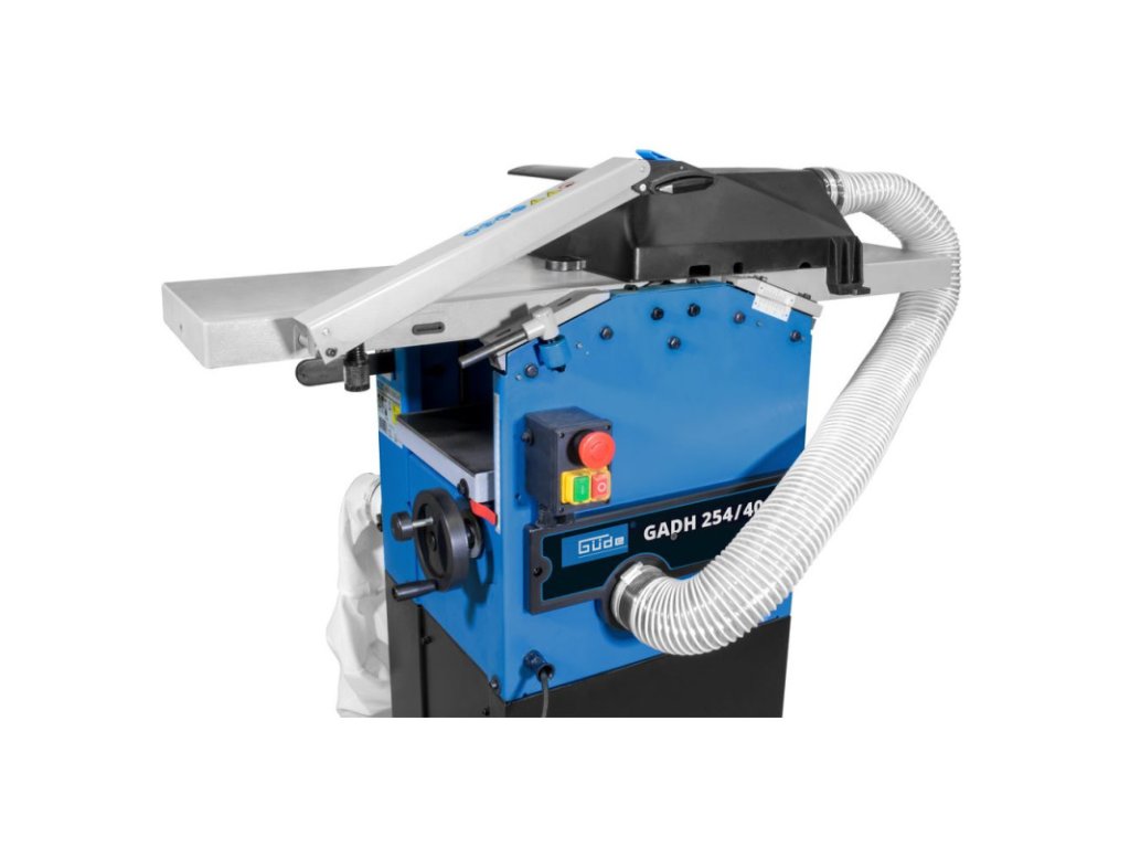 Kombinovaný drevoobrábací stroj (hobľovačka - zrovnávačka) s integrovaným odsávacím zariadením s externým vreckom na zber pilín, určený ku komplexnému opracovaniu plochých/hranolových profilov z masívneho dreva. Hobľovacie stoly z tlakovo liateho hliníka. Nastavenie hrúbkovacieho stola ručným kolieskom. Bezpečnostný spínač s uvoľnením nulového napätia, istič. Uzavretá základňa, hriadeľ noža s 2 hobľovacími nožmi HSS, paralelný doraz. Integrované kolieska pre ľahký transport.