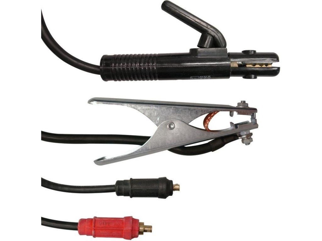 Uzemňovací kábel 1,5 m (16 mm2) s ukostrovacou svorkou, držiak elektród s káblom 1,5 m (16 mm2), nástrčný konektor 9 mm. Vhodný ku zváračkám s kódom tovaru 20005, 20007, 20056, 20055, 20057, 20046, 20047.