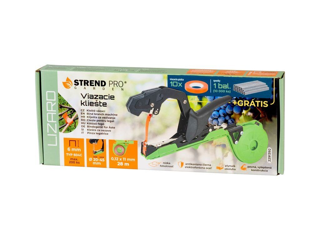 Viazacia sada Lizard obsahuje všetko, čo potrebujete na rýchle a efektívne viazanie rastlín v záhrade, viniciach alebo v sadoch. Sada zahŕňaprofesionálne viazacie kliešte,10 ks náhradných pásoka10 000 ks spôn, čo umožňuje dlhodobé a plynulé používanie bez potreby častého dopĺňania materiálu.