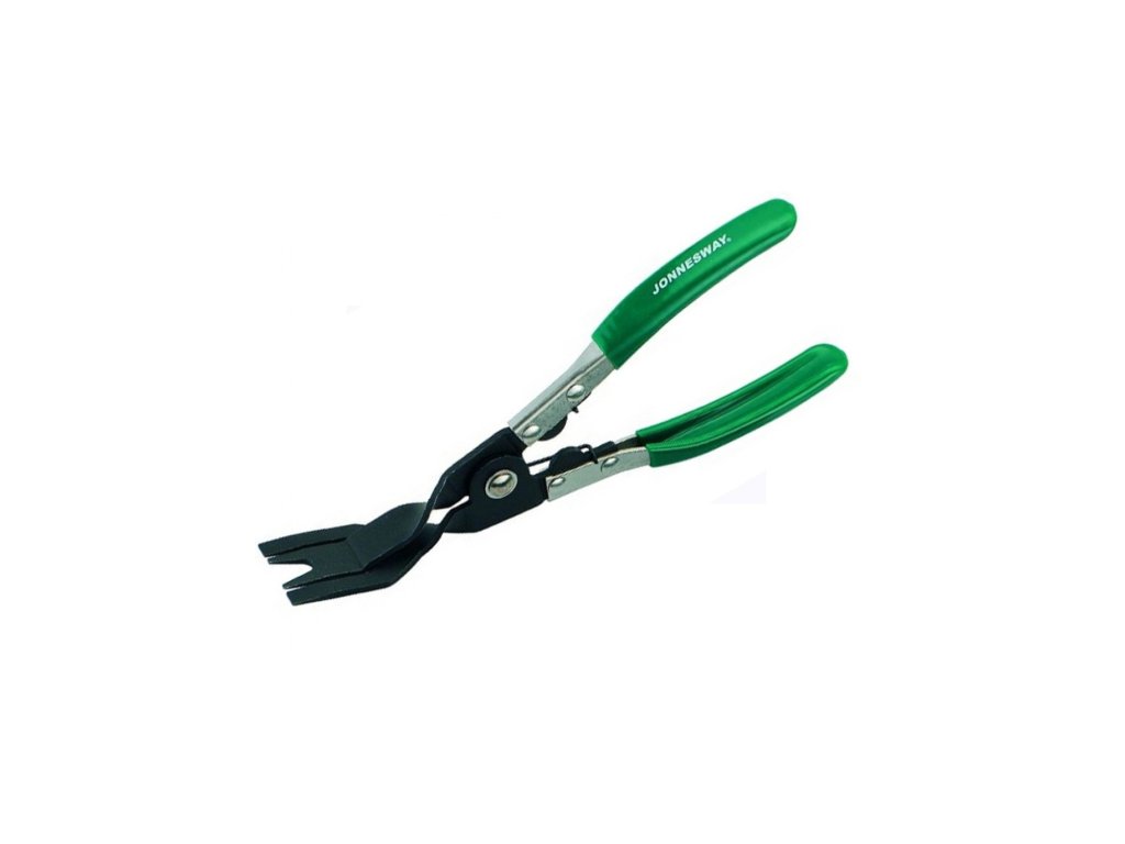 Kliešte na čalúnenie JONNESWAY® AB030062. Kliešte sú v prvom rade určené na demontovanie, odpojenie plastových klipov ktoré držia čalúnenie o karosériu v interiéry auta. Vhodné napríklad na demontáž líšt, ozdôb karosérie a čalúnenie dverí, atď. Profesionálna kvalita, odporúčaná pre použitie v automobilovom priemysle. Čeľuste kliešti tvoria dve vidličky väčšiu a menšiu ktoré sa pri stlačení kliešti otvoria. Rukoväte zaliate v PVC pre lepší komfort a držanie v ruke. Pružinový systém spätného otvorenia rukovätí.
