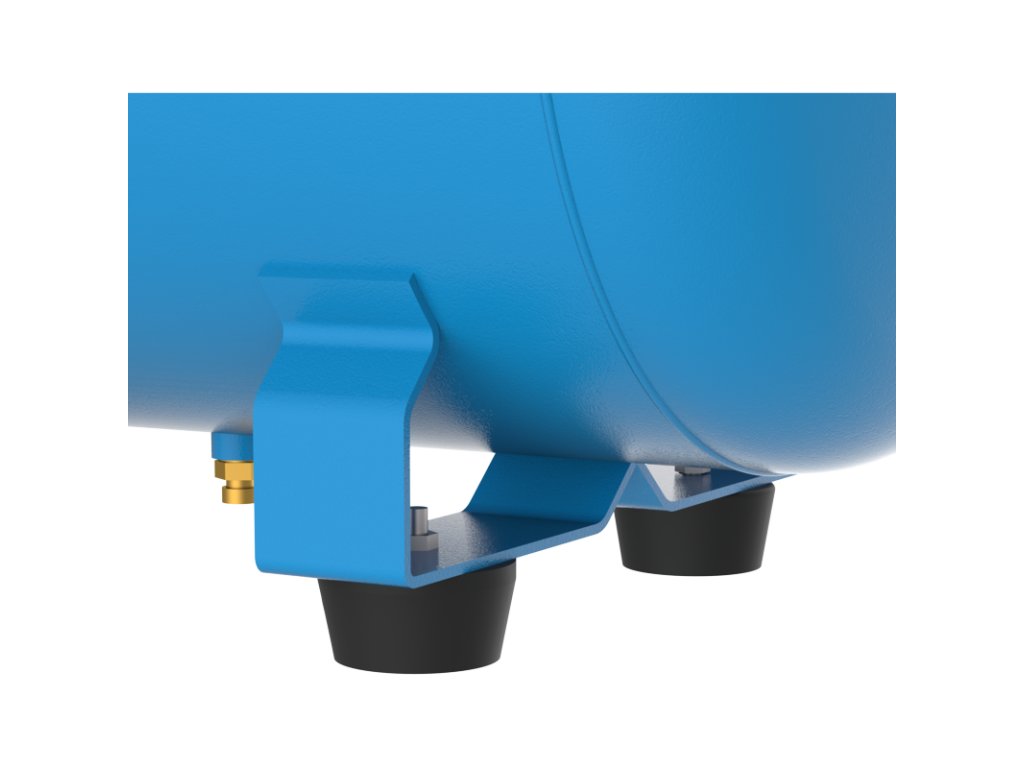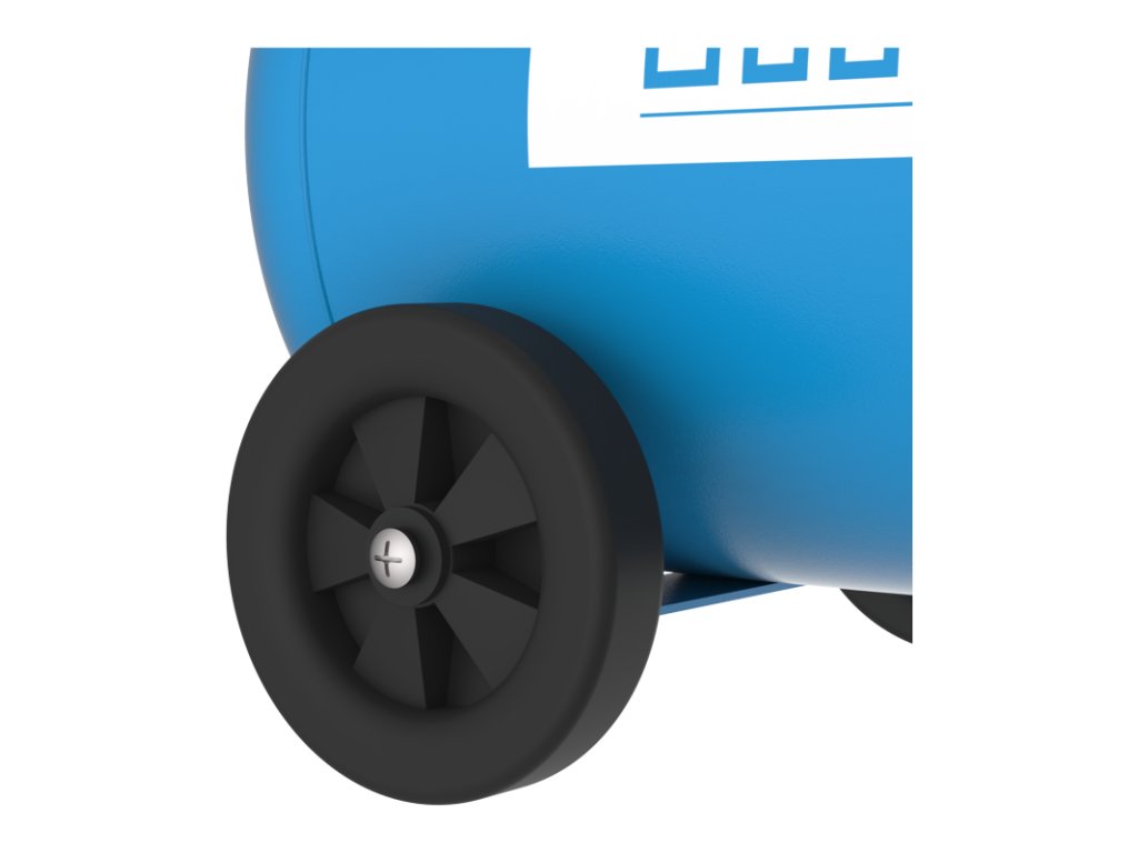 Jednovalcový piestový kompresor s olejovým mazaním, priamy pohon, dva manometre (manometer na meranie tlaku v nádobe a manometer na meranie pracovného tlaku), jedna spojka na stlačený vzduch, redukčný, bezpečnostný a spätný ventil, vzduchový filter, transportná rukoväť. Nožičky s gumovým dorazom, plastové kolesá.