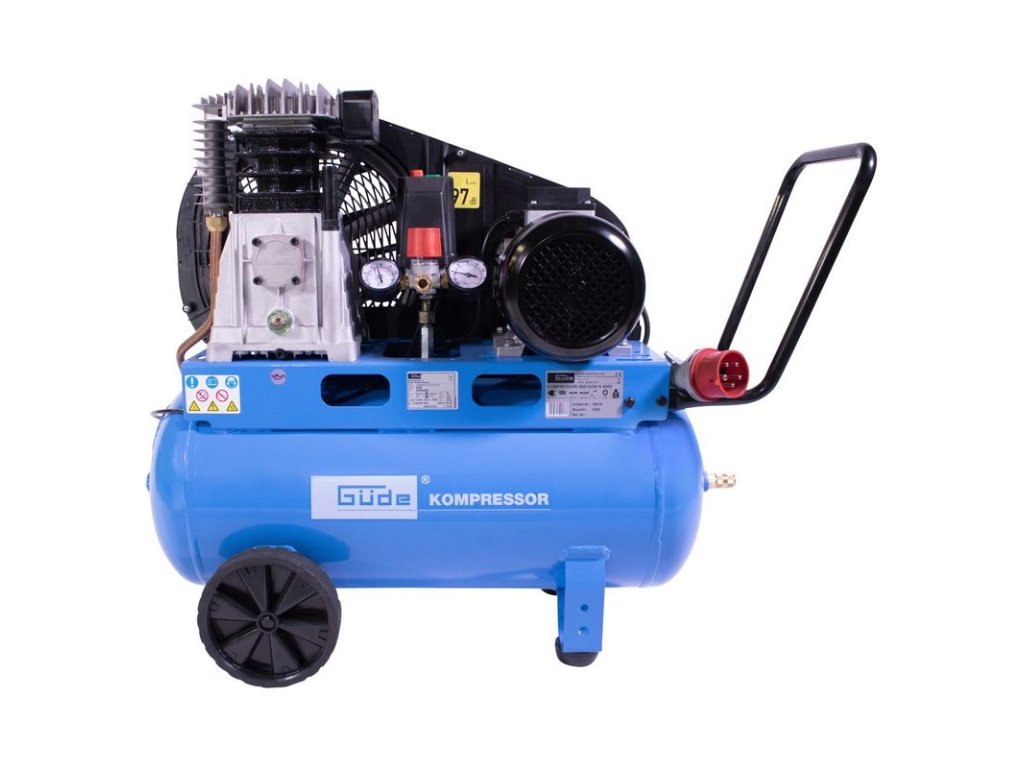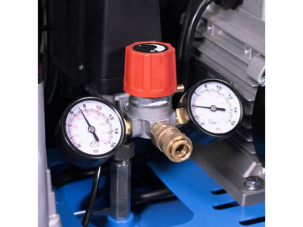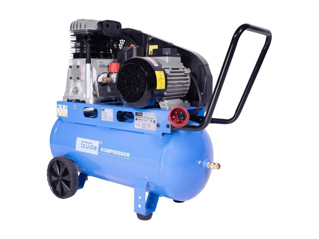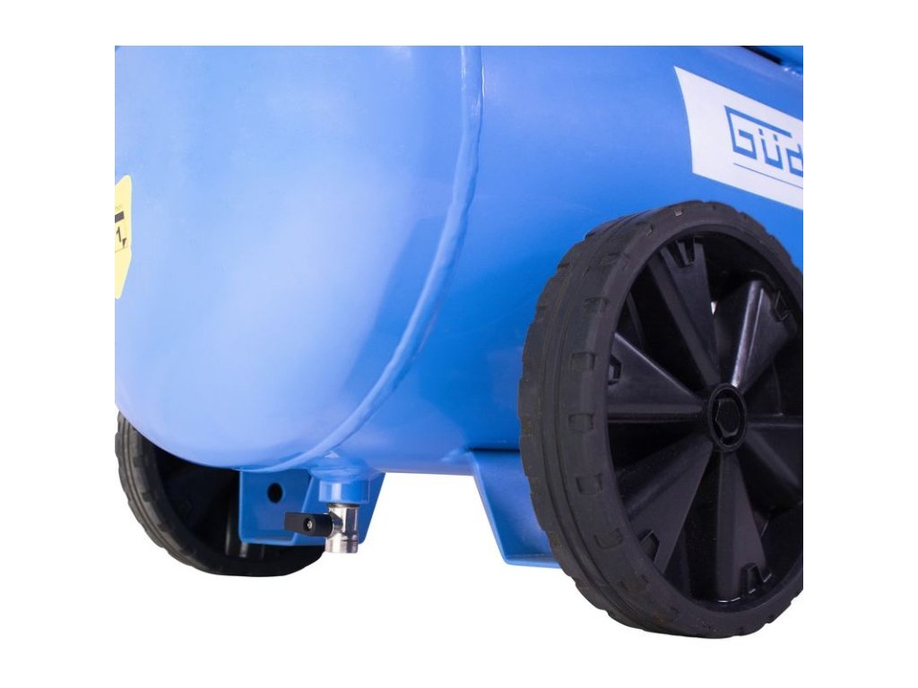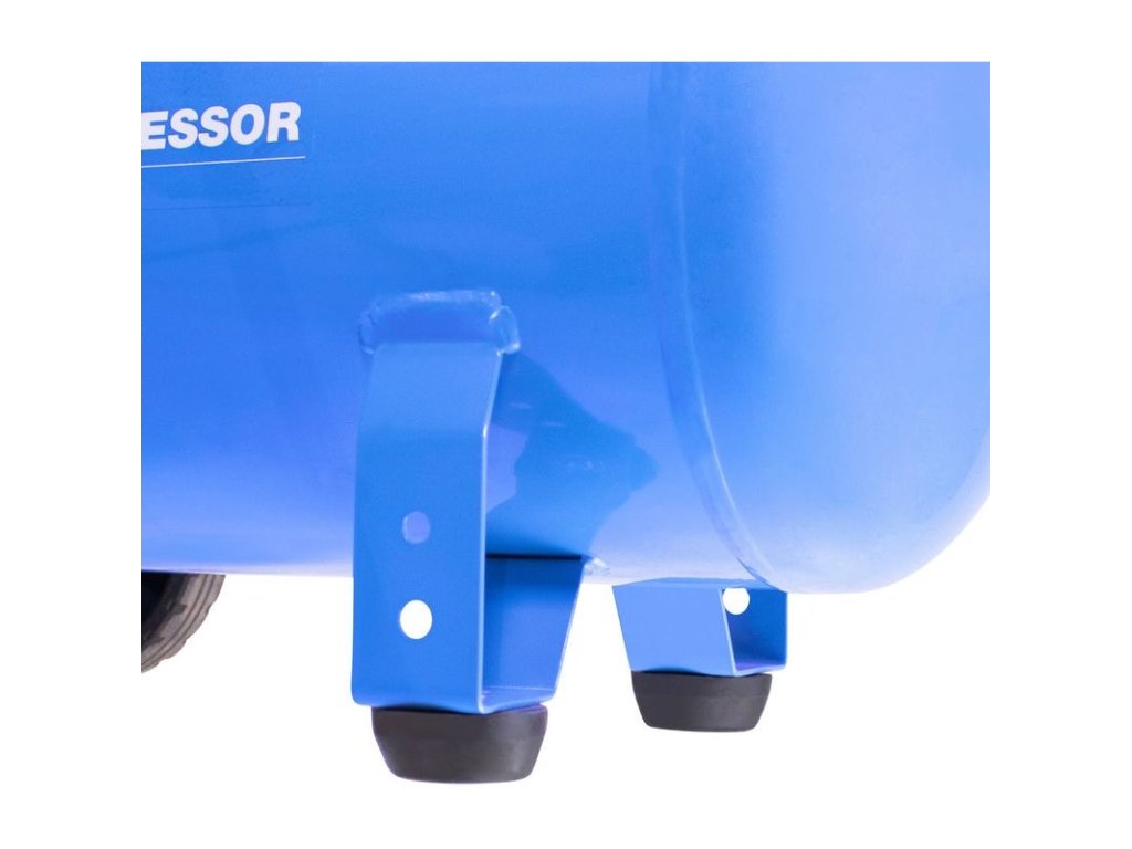 Dvojpiestový kompresor s olejovým mazaním, s remeňovým pohonom. Tlakový spínač, manometer tlaku v nádobe a manometer pracovného tlaku, 2 spojky na stlačený vzduch, dodatočný chladič, poistný ventil, spätný ventil, vypúšťací ventil na kondenzát, vzduchový filter, ochrana proti preťaženiu. Dvojitá noha s gumovým nárazníkom, plastové kolesá, prepravná rukoväť.