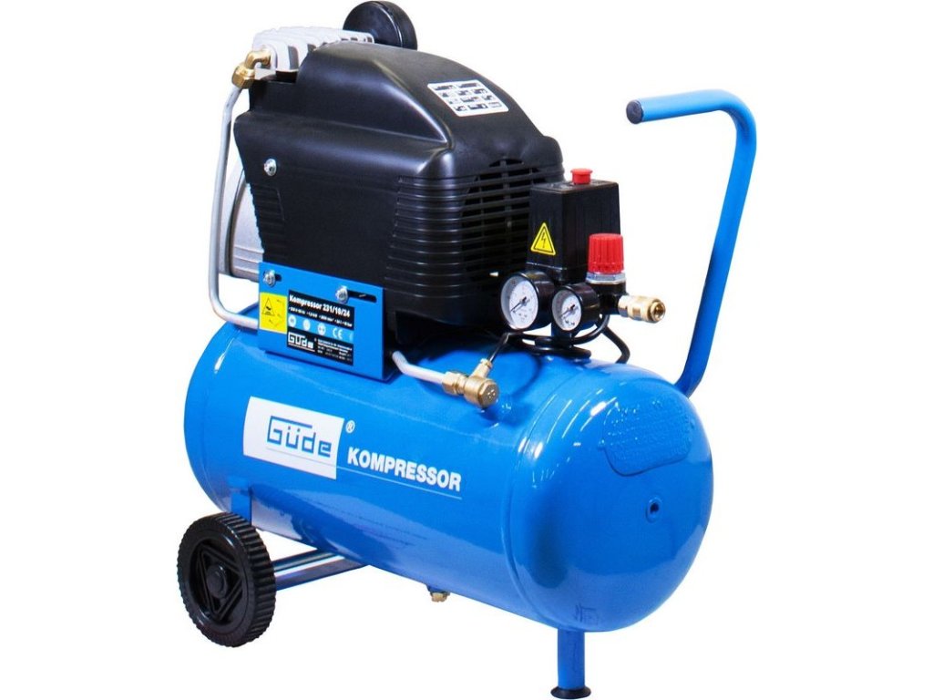 Jednovalcový kompresor s olejovým mazaním, s priamym pohonom. Tlakový spínač, manometer tlaku v nádobe a manometer pracovného tlaku, 2 spojky na stlačený vzduch, redukčný ventil pracovného tlaku, poistný ventil, spätný ventil, vypúšťací ventil na kondenzát, vzduchový filter. Noha s gumovým nárazníkom, plastové kolesá, prepravná rukoväť.