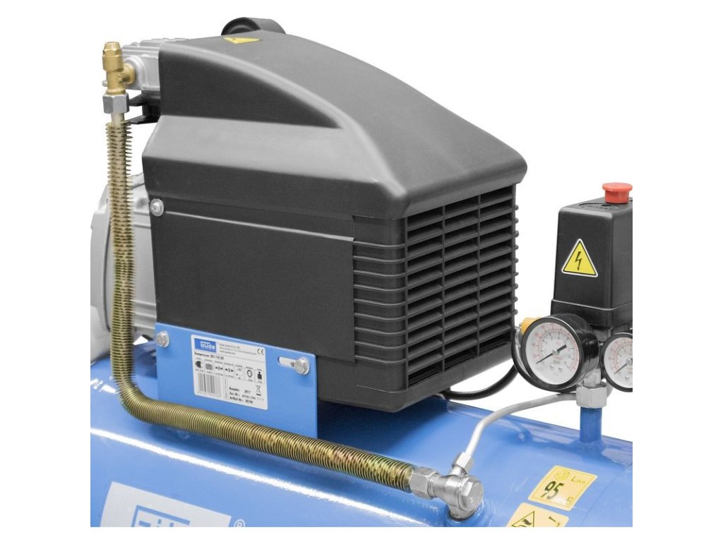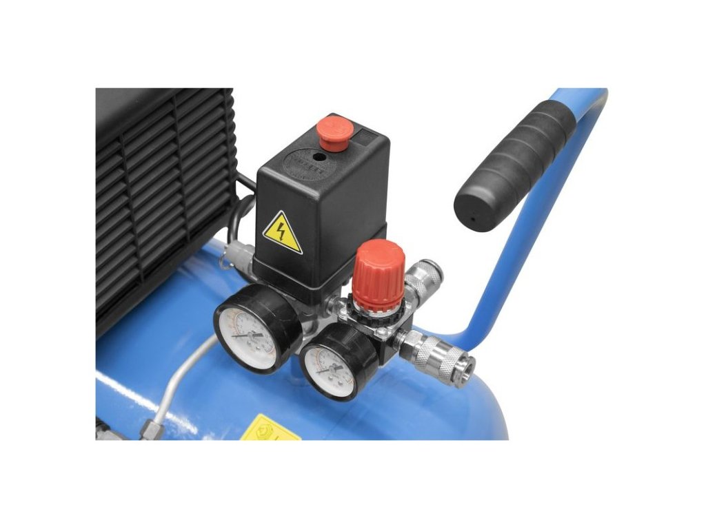 Jednovalcový kompresor s olejovým mazaním, s priamym pohonom. Manometer tlaku v nádobe a manometer pracovného tlaku, 2 spojky na stlačený vzduch, redukčný ventil, poistný ventil, vypúšťací ventil na kondenzát. Dvojitá noha s gumovým nárazníkom, plastové kolesá, prepravná rukoväť. Sada náradia na stlačený vzduch obsahuje 5 m PU hadicu špirálovú so spojkou, fúkaciu pištoľ, hustilku pneumatík, 8 ks adaptérov na nafukovacie matrace, lopty a podobne.