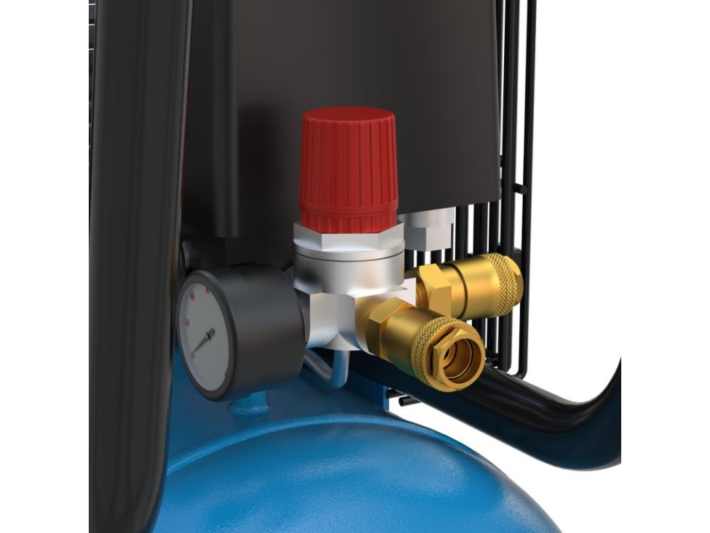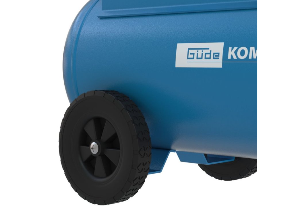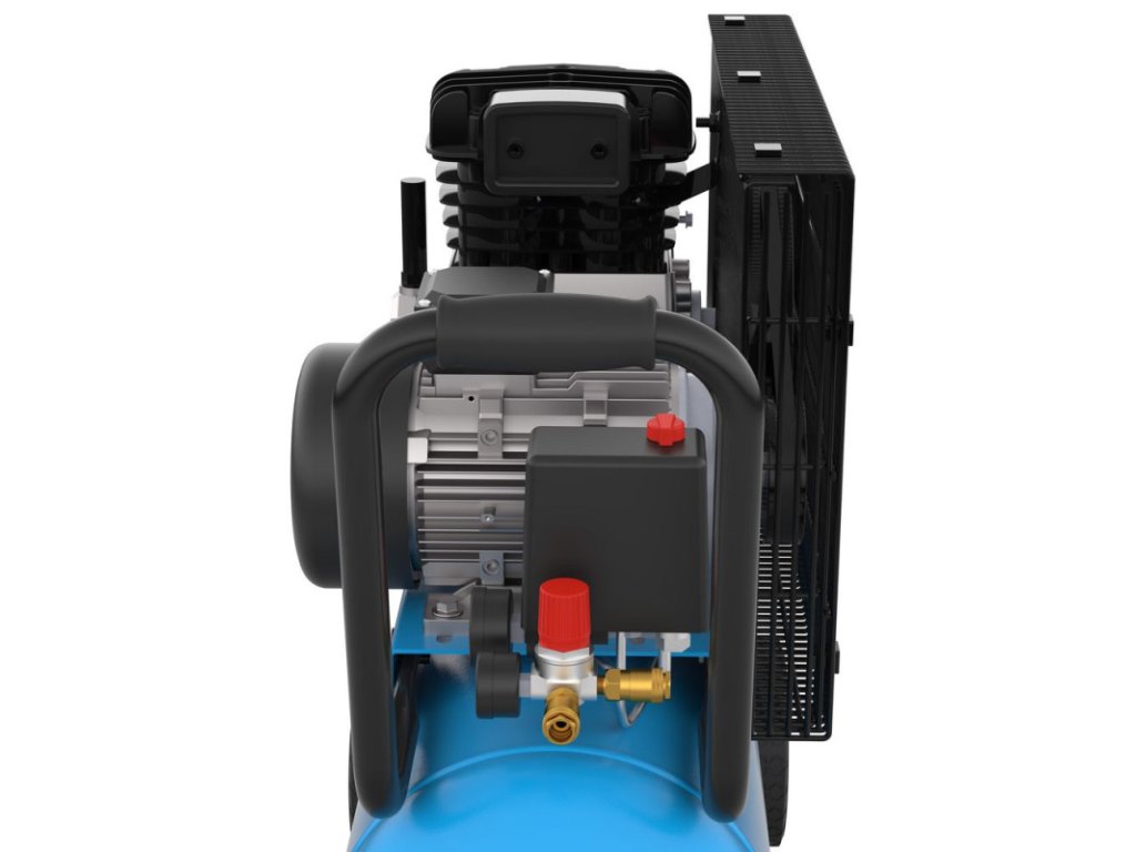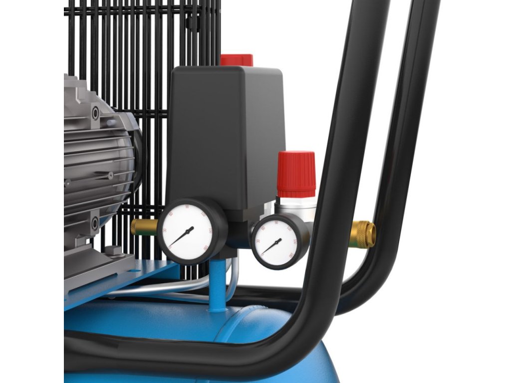 Kompresor s olejovým mazaním, remeňovým pohonom a rukoväťou na prenášanie zabezpečuje spoľahlivú dodávku stlačeného vzduchu. Tlakový spínač riadi pracovný tlak, zatiaľ čo manometer zobrazuje tlak v nádobe a pracovný tlak. Dve pneumatické spojky umožňujú jednoduché pripojenie. Vďaka chladiču plniaceho vzduchu, bezpečnostnému ventilu, spätnému ventilu, vypúšťacej skrutke na kondenzát, vzduchovému filtru a ochrane proti preťaženiu je zaručená bezpečnosť a efektívnosť. Dvojitá základňa s gumenými nárazníkmi zaisťuje bezpečné postavenie, pevné plastové kolieska na jednoduché presúvanie.