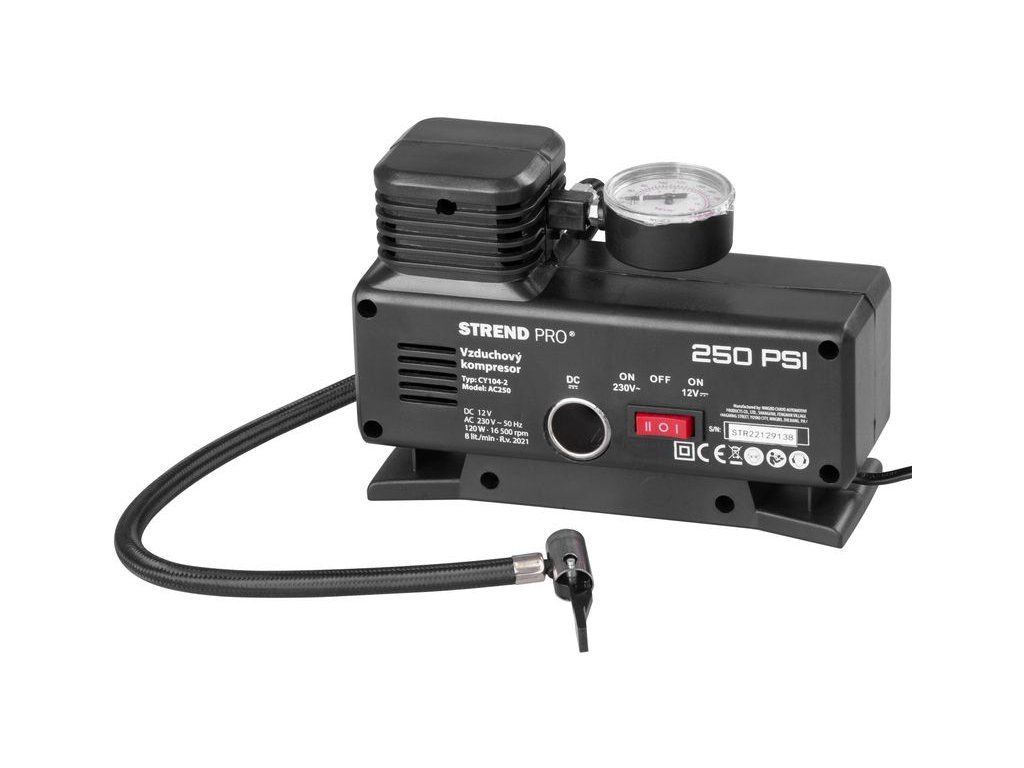 Vzduchový kompresor AIRCOM AC250 je spoľahlivým pomocníkom do každej domácnosti. Je vhodný na prácu so stlačeným vzduchom s tlakom až 250 PSI (18 bar). Výhodou je jednoduchosť prevedenia, vďaka čomu sa zmestí takmer na každú poličku. Je vybavený 3 m dlhým káblom (12V), 1.8m káblom (230V) a meračom tlaku. Pre správne fungovanie ho stačí zapojiť do elektrickej siete (230 V/12 V) alebo do zásuvky zapaľováča čo oceníte na cestách.