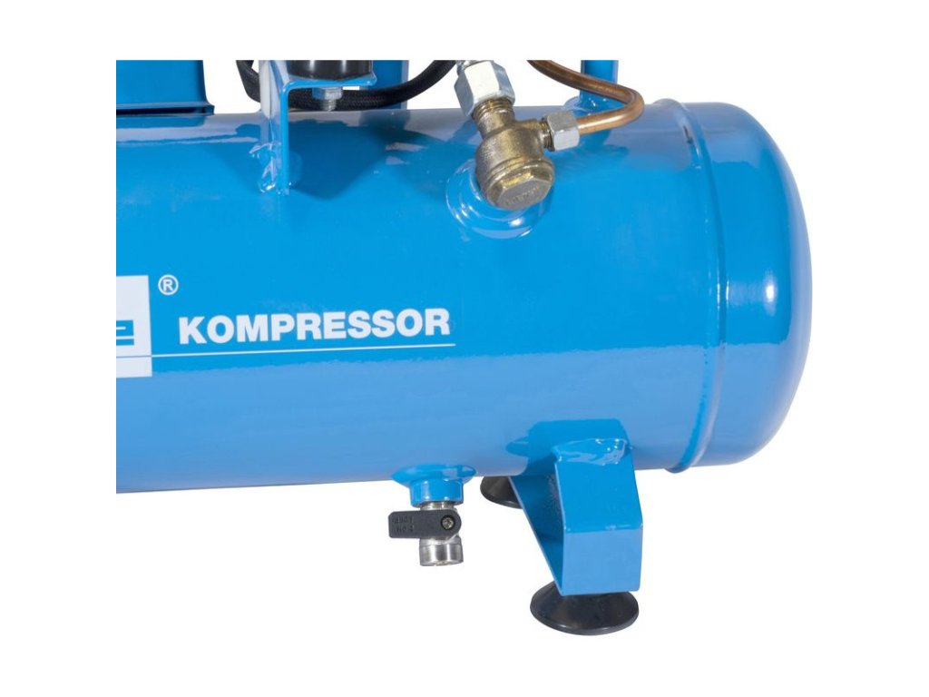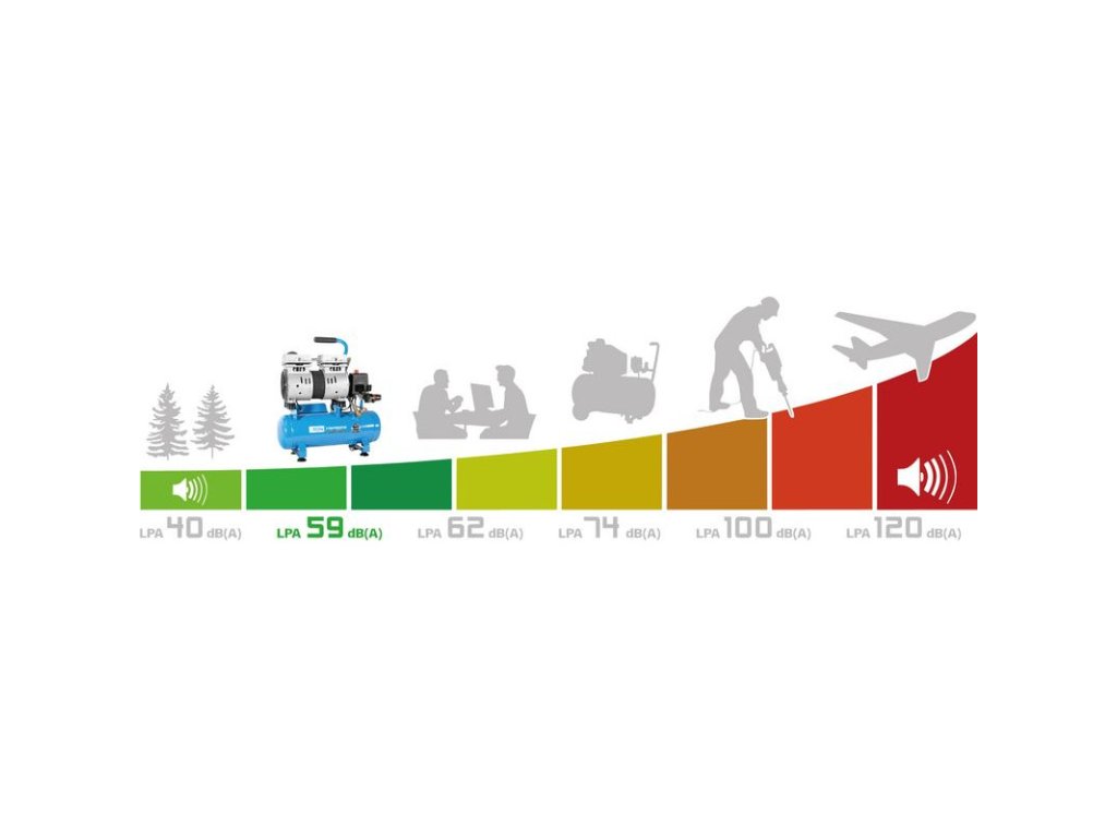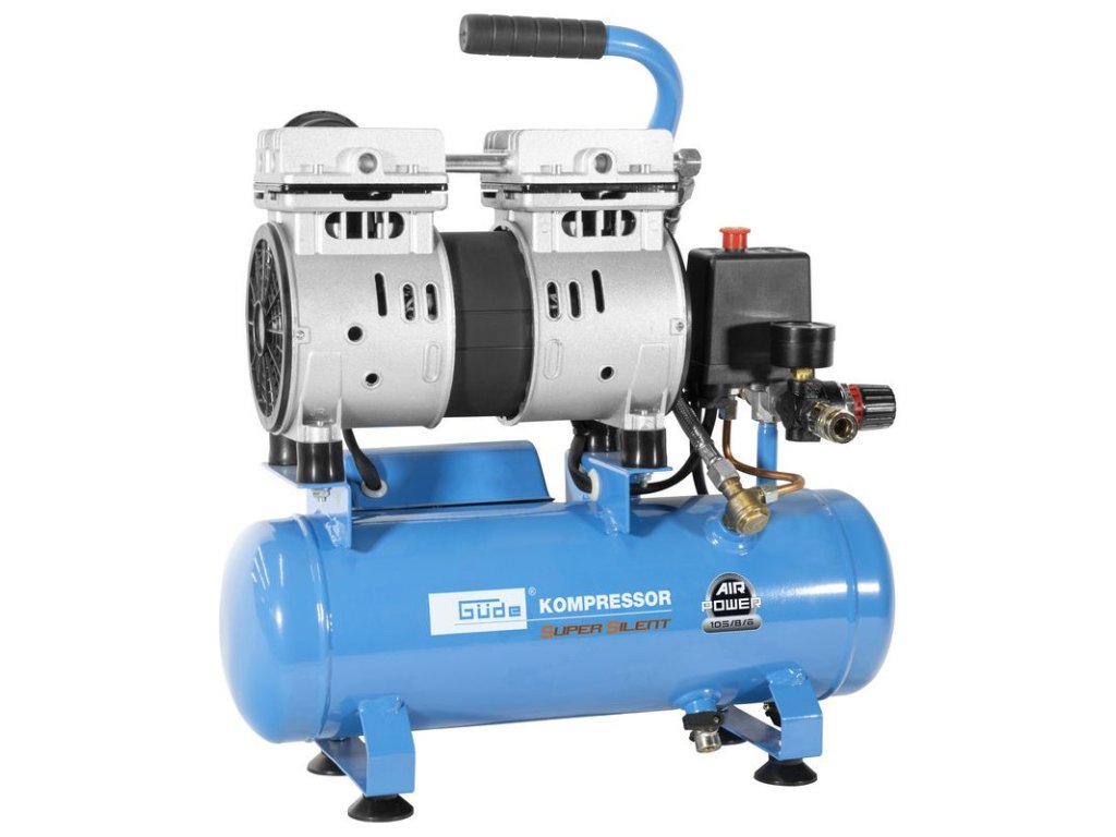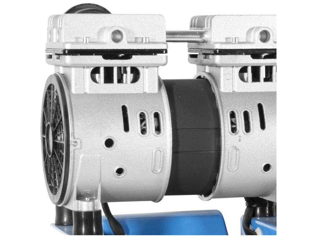 Bezolejový tichý kompresor s priamym pohonom. Mechanický tlakový spínač, manometer na meranie pracovného tlaku, 6-litrová nádoba s gumovými tlmičmi, rukoväť na prenášanie, 1 pneumatická spojka, bezpečnostný ventil a vypúšťacia skrutka na kondenzát.