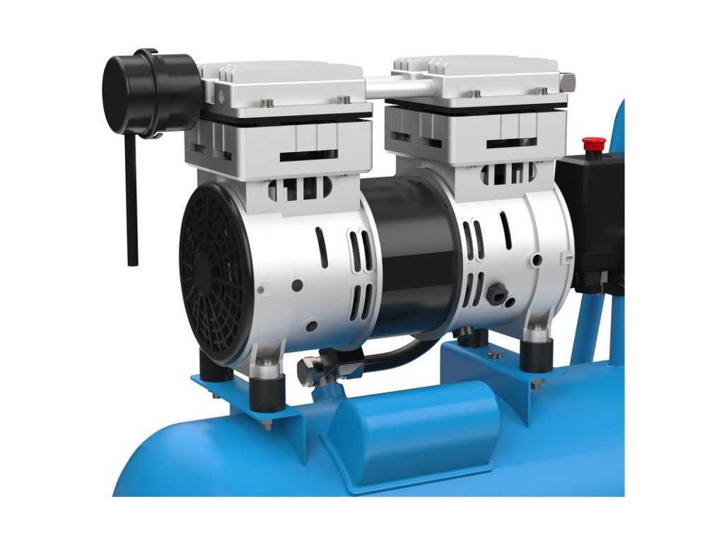 Bezolejový dvojvalcový piestový kompresor, dvojpiestový agregát s priamym pohonom. Mechanický tlakový spínač, manometer na meranie tlaku v nádobe a pracovného tlaku, 24-litrová nádrž s gumovými tlmičmi, rukoväť na prenášanie. Tichý chod. Jedna pneumatická spojka, bezpečnostný ventil a vypúšťacia skrutka na kondenzát.