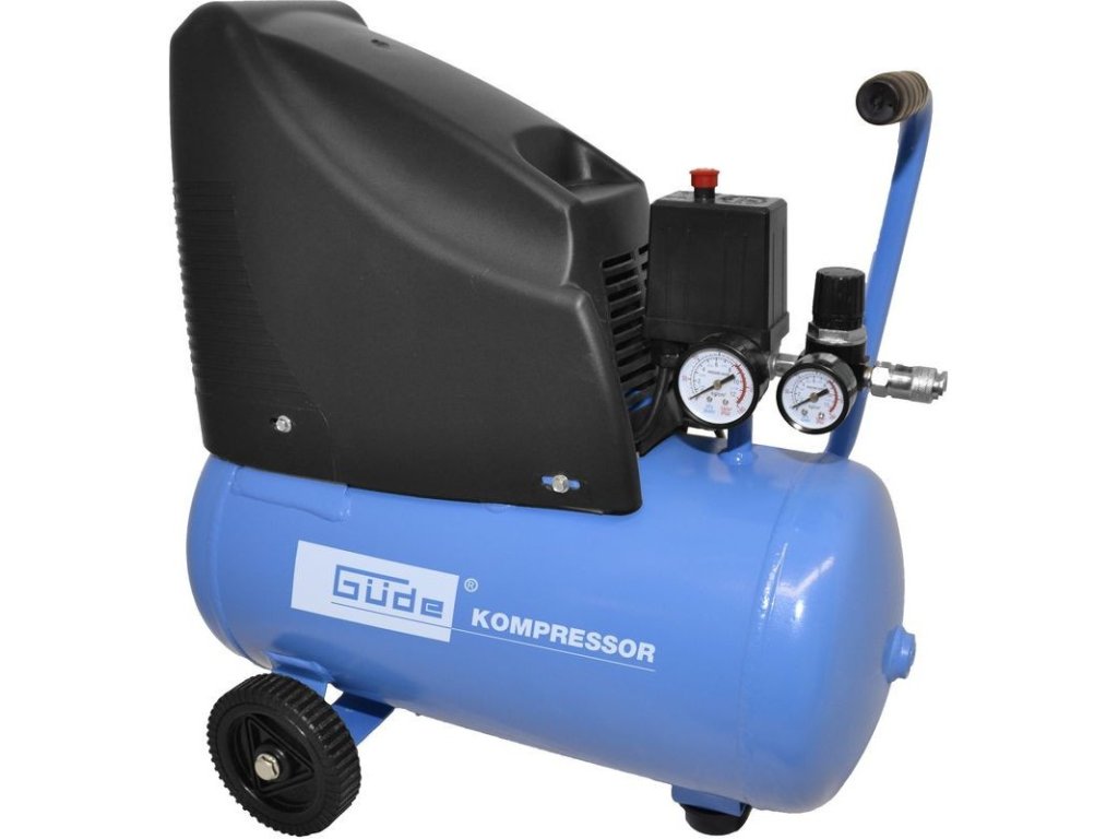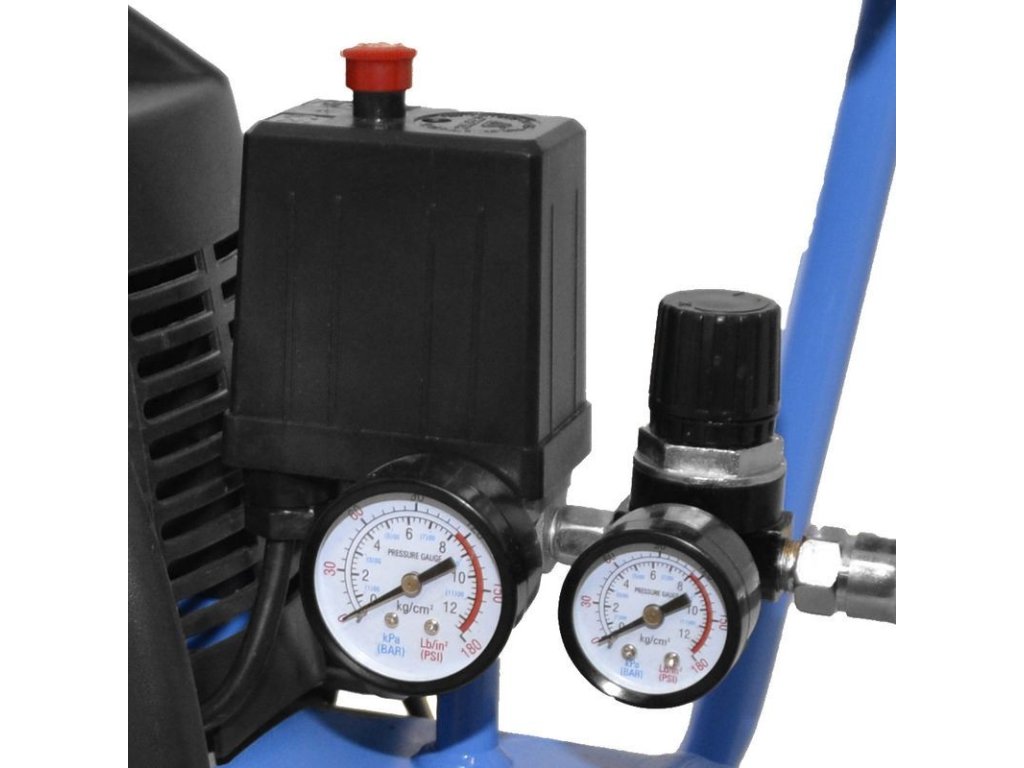 Bezolejový 1-valcový piestový kompresor s priamym pohonom, rukoväť, manometer tlaku v kotle a pracovného tlaku. Redukcia tlaku, 1 spojka stlačeného vzduchu, poistný ventil a skrutka na vypúšťanie kondenzátu, spätný ventil. Vzduchový filter.