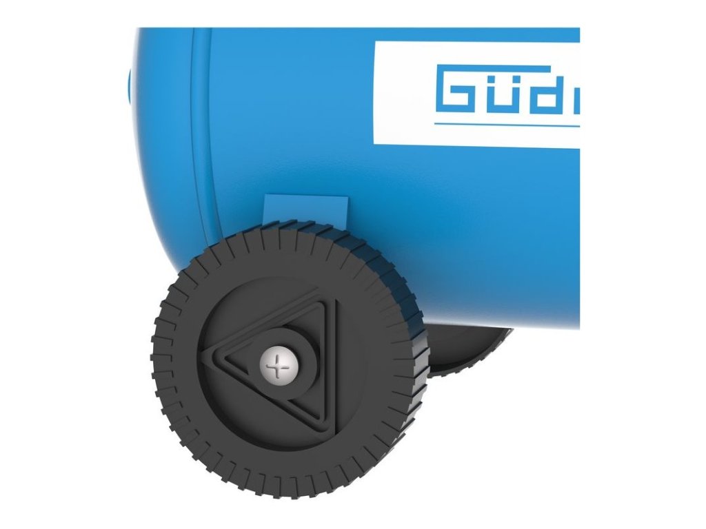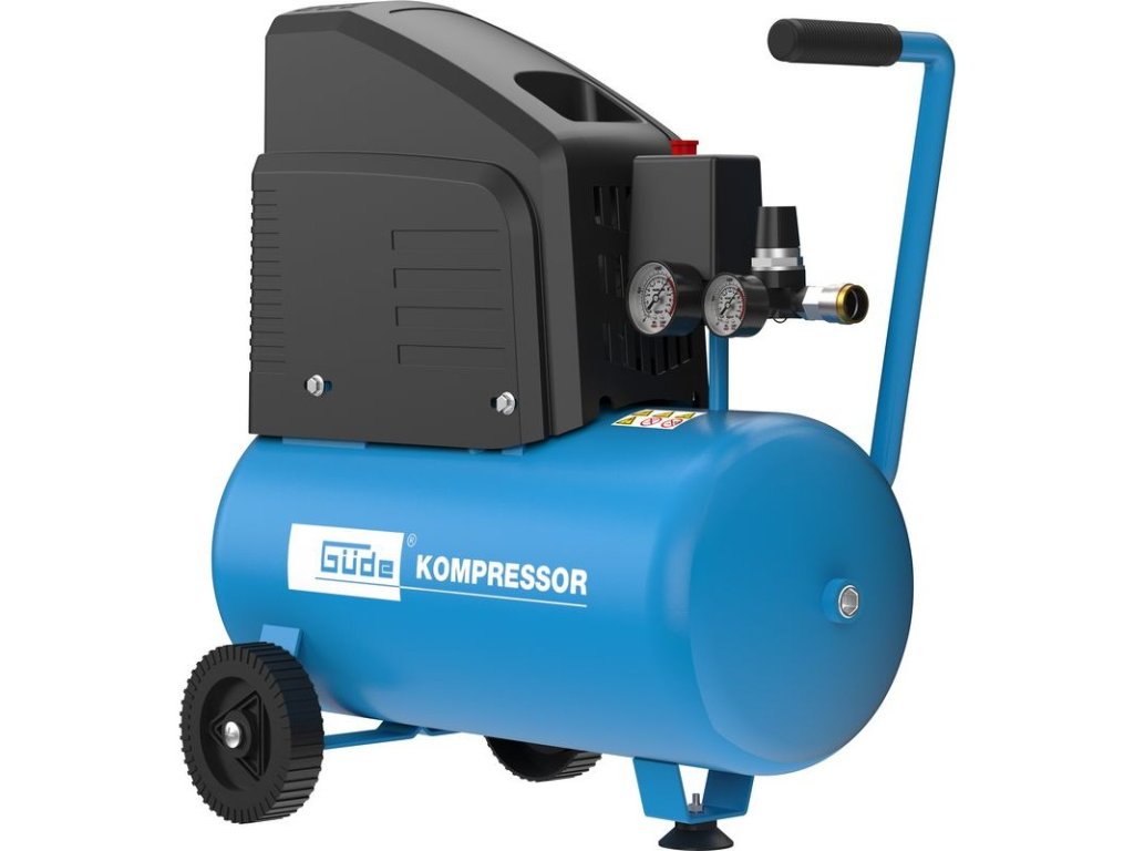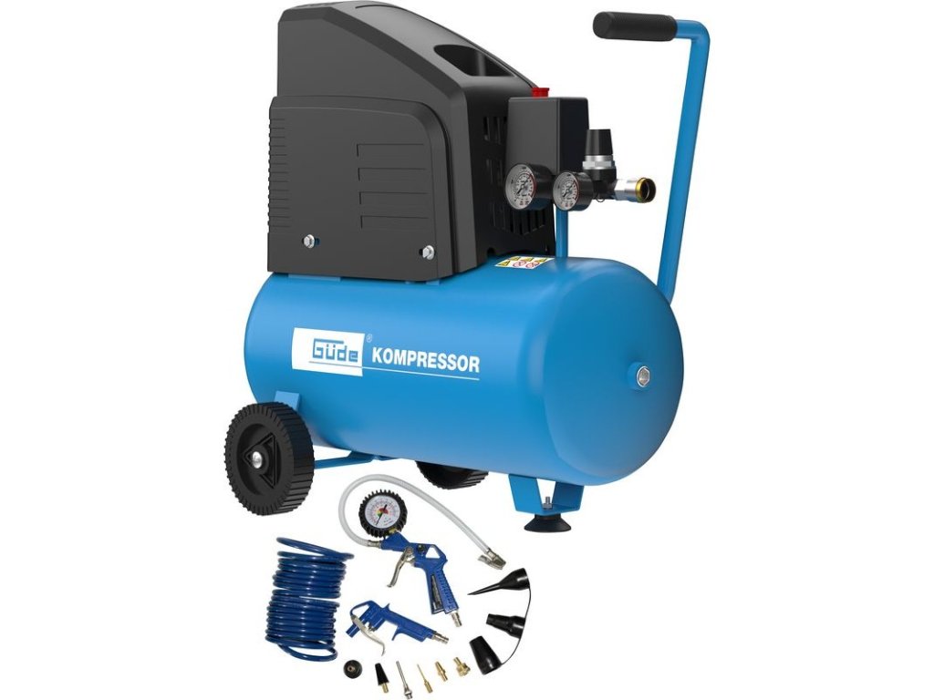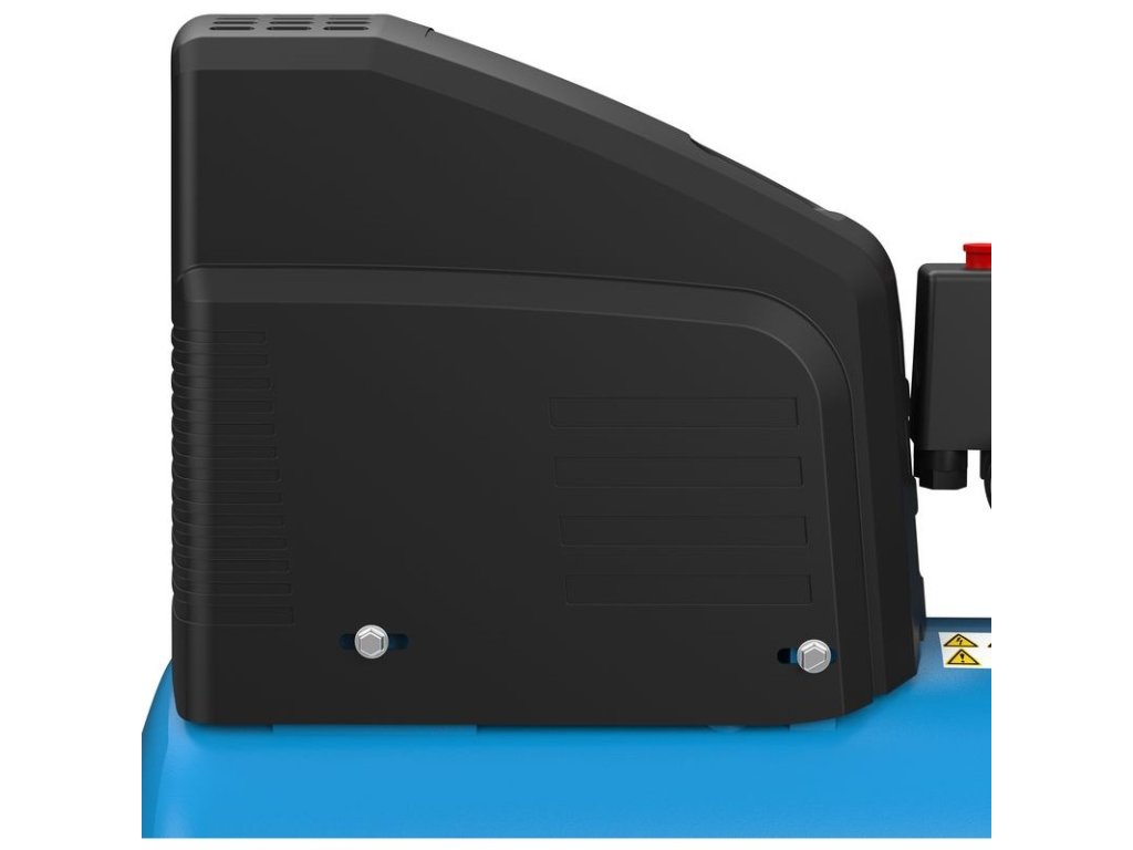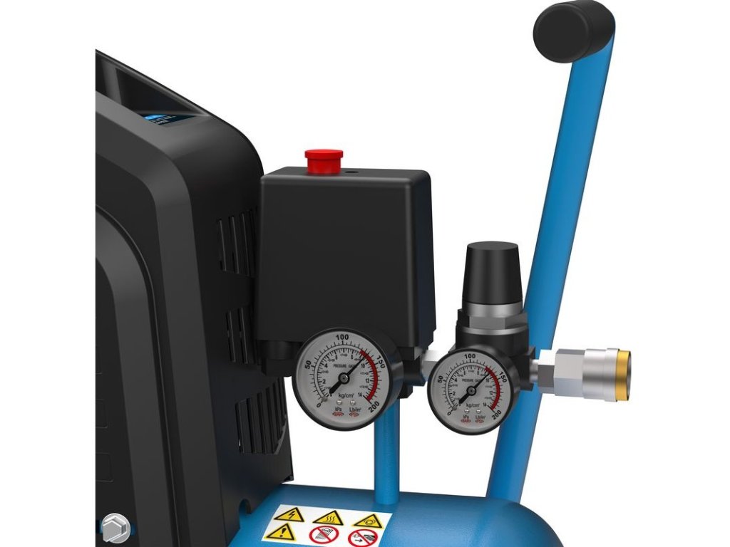 Jednovalcový bezolejový piestový kompresor s priamym pohonom, dva manometre (manometer na meranie tlaku v nádobe a manometer na meranie pracovného tlaku), redukčný ventil, 1 spojka na stlačený vzduch, bezpečnostný ventil a kondenzačná výpustná skrutka, integrovaný vzduchový filter. Transportná rukoväť, gumový doraz pre stabilnú pozíciu, plastové kolesá.