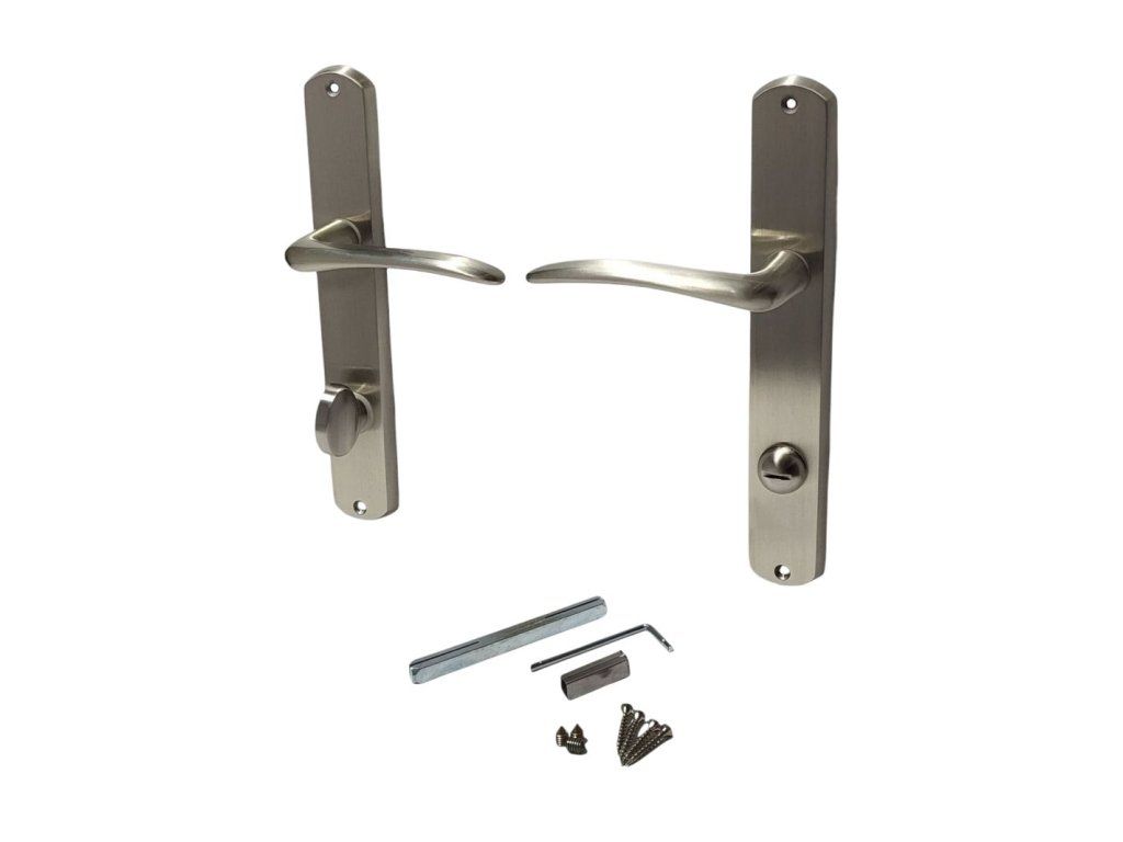Súprava obsahuje dva kľučkové štíty s aerodynamicky tvarovanými kľučkami na dlhých štítových rozetách s oblými vrchmi. Na jednej strane je umiestnená otočná palička (gombík) pre zaistenie dverí zvnútra, na druhej strane sa nachádza núdzová výpusť vo forme štrbiny, čo umožňuje otvoriť dvere aj zvonku v prípade núdze. Dizajn kovaní je čistý a moderný, vhodný do rôznych interiérových štýlov od klasického po súčasný.