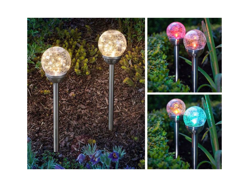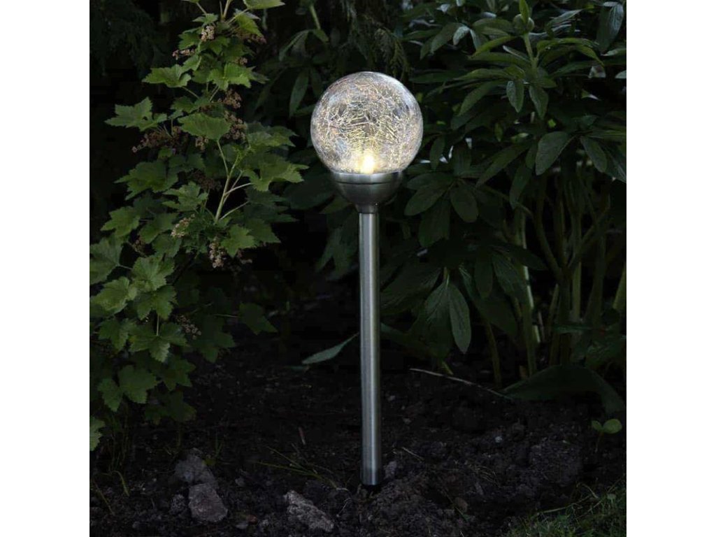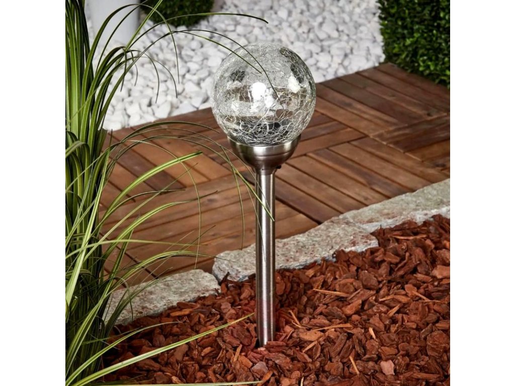 Štýlová záhradná solárna lampa je moderným doplnkom každej záhrady, svieti teplou bielou farbou alebo farebne, skvele sa hodí ku chodníku či kvetinovému záhonu. Má dizajn popraskanej gule. Je vyrobená z kvalitnej nehrdzavejúcej nerezovej ocele a skla. Počas dňa solárny panel konvertuje slnečnú energiu na elektrickú energiu, ktorá sa ukladá do dobíjateľnej batérie. V noci sa svetlo automaticky zapne a využíva uloženú energiu. Lampa tak prostredníctvom 2x LED diód svieti príjemným svetlom. Rozmery tejto lampy sú 12x44 cm.