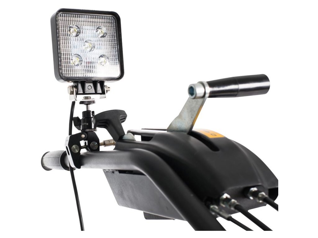 Výkonné pracovné LED svetlo. Pracovné svetlo je pripojené priamo k 12-voltovej batérii stroja Pro Trac. To eliminuje potrebu tráviť čas nabíjaním lampy, keď sa nepoužíva. Svietidlo je dodávané so silnou oceľovou konzolou pre montáž na riadidlá, ktorú možno nakloniť nahor a nadol v závislosti od oblasti, ktorú chcete osvetliť. Pracovná lampa zaistí, že môžete pracovať aj v tme. Svietidlo sa skladá z 5 LED žiaroviek 15W, ktoré poskytujú veľmi silné svetlo so svetelnou kapacitou 1000 lumenov.Vhodné pre modely Pro Trac 950DE, Pro Trac 950TGE, Pro Trac 1350BE .Pre okrúhly konektor (modely od roku 2016).Dodatočné parametre