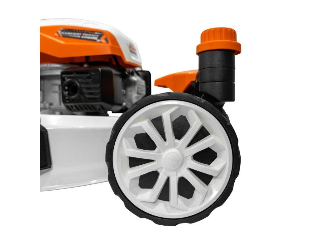 Hlavnou výhodou kosačky na trávu RURIS RX1000 je jej manévrovateľnosť, ktorá uľahčuje jej používanie vďaka vybaveniu 360-stupňovým systémom otáčania predných kolies.