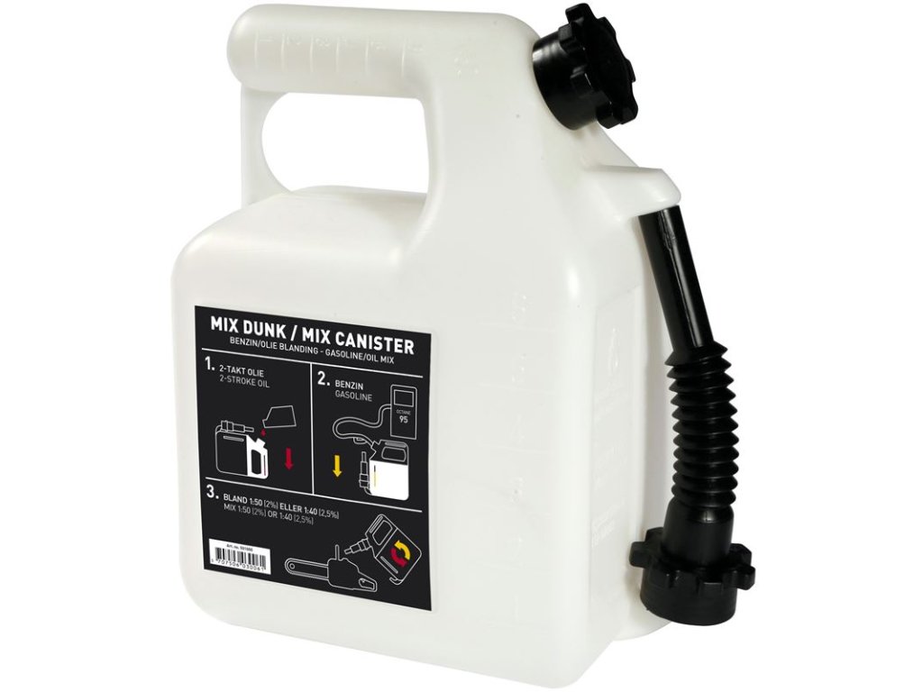 Bandaska na benzín je špeciálne navrhnutá na jednoduché a správne miešanie 2-taktného oleja/benzínu. Jedna strana ukazuje 2% zmes (1:50) a druhá strana ukazuje 2,5% zmes (1:40)1) Dajte bandasku rukoväťou dole a pridajte olej pre 2-taktné motory po požadovanú značku na rukoväti (napr. 4).2) Potom ju otočte a doplňte benzín E5 na rovnakú úroveň (riadok 4).3) Naskrutkujte uzáver palivovej nádrže a zatraste nádobou, aby sa obsah premiešal (pozri video).Potom ste správne nadávkovali 2-taktné palivo pre vašu motorovú pílu, krovinorez atď.Objem: 5 litrov. Vrátane inteligentného plniaceho hrdla, ako je znázornené na obrázku.Klikni video.Dodatočné parametre