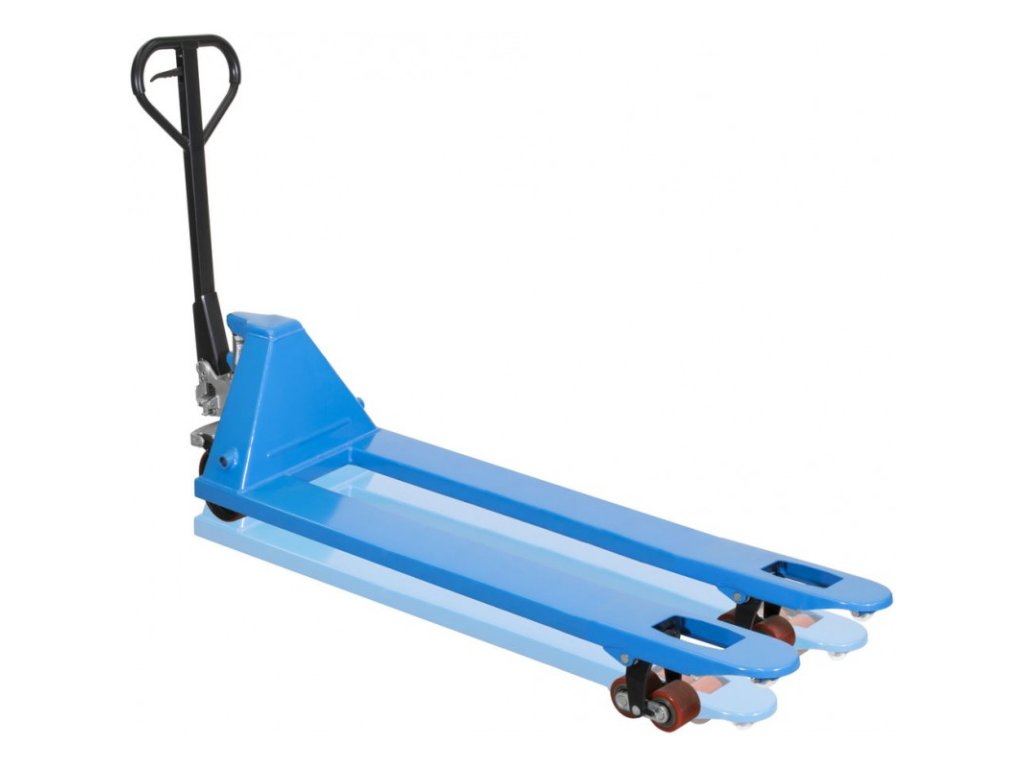 Paletový vozík je spoľahlivým pomocníkom pri preprave nákladov v sklade alebo dielni. Pevná oceľová konštrukcia odolná proti skrúteniu a stĺpik riadenia otočný o 180° zaisťuje spoľahlivú prepravu nákladu. Vďaka obzvlášť dlhej vidlici je ideálny na premiestňovanie veľmi dlhých paliet s dĺžkou až 1,8 metra. Funkcia zdvíhania sa vykonáva pomocou oja s ovládaním ventilu. Funkciu spustenia je možné vyvolať na rukoväti a dodatočne na integrovanom nožnom pedáli. Polyuretánové kolieska zaisťujú tichý chod na tvrdých podlahách. Kyvne uložené tandemové záťažové kolieska. Pomocné nábehové kolieska pre nakladanie paliet zboku.
