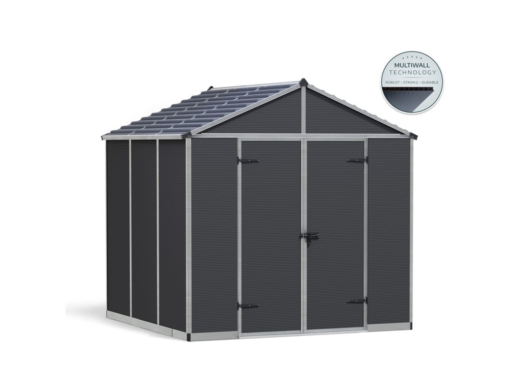 Prostorný, odolný a bezúdržbový zahradní domek Základní domek lze mít ve dvou rozměrových variantách, a to buď 228 x 237 cm nebo 304 x 237 cm Domek je vyroben ze špičkového vyztuženého polykarbonátu se 100% UV ochranou, takže materiál (na rozdíl od levných domků z polyethylenu PE) nekřehne ani nemění barvu a bez problémů odolá změnám teplot, dešti, přívalům sněhu nebo kroupám po mnoho let. Zesílená konstrukce z hliníkových profilů nikdy nezrezaví Dodává se s protiskluzovou podlahou, takže věci v domku jsou chráněny před vlhkostí, vodou apod. Unikátní střecha z polykarbonátu propouštějícího světlo příjemně prosvětluje domek zevnitř Polykarbonát je bezúdržbový, prakticky nerozbitný a snadno se čistí. Žádné starosti s nátěrem, hnilobou, dřevokazným hmyzem, vlhkostí či rzí. Široké (cca 129 cm) dvojité zamykatelné dveře v hliníkovém rámu s nízkým prahem a ocelovými panty Možnost vybavit LED osvětlením a poličkami Skylight Shelf, které se jednoduše montují do drážek rámu domku. Standardně dva větrací otvory, integrované okapy, speciální vnitřní kovové výztuhy Snadné sestavení svépomocí, panely se do konstrukce nasouvají a není tak potřeba stovky šroubků, jako u jiných konstrukcí Ideální pro uložení nářadí, nábytku, grilu, sekačky a dalšího zahradního náčiní Krásná moderní tmavě antracitová barva Materiály domku jsou 100% recyklovatelné Sněhová odolnost : 80 kg/m2 Odolnost proti větru : 105 km/hod Prostupnost světla : Střecha – 10% Pevný hliníkový rám s integrovanými okapy Střecha s praktickým prosvětlením interiéru Přídavné kovové výztuhy pro extra pevnost Protiskluzová podlaha Prostorný vstup s nízkým prahem Uzamykatelné dveře Kotvící systém pro zvýšení stability 100 % UV odolný, 10 mm široký, zesílený polykarbonátDodatočné parametre