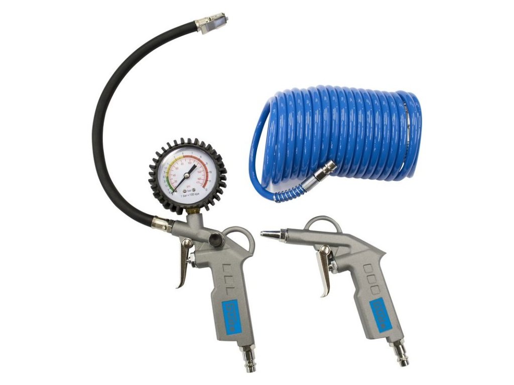 Hustilka pneumatík s rýchlospojkou. Vyfukovacia pištoľ s rýchlospojkou. Špirálová hadica s rýchlospojkou.