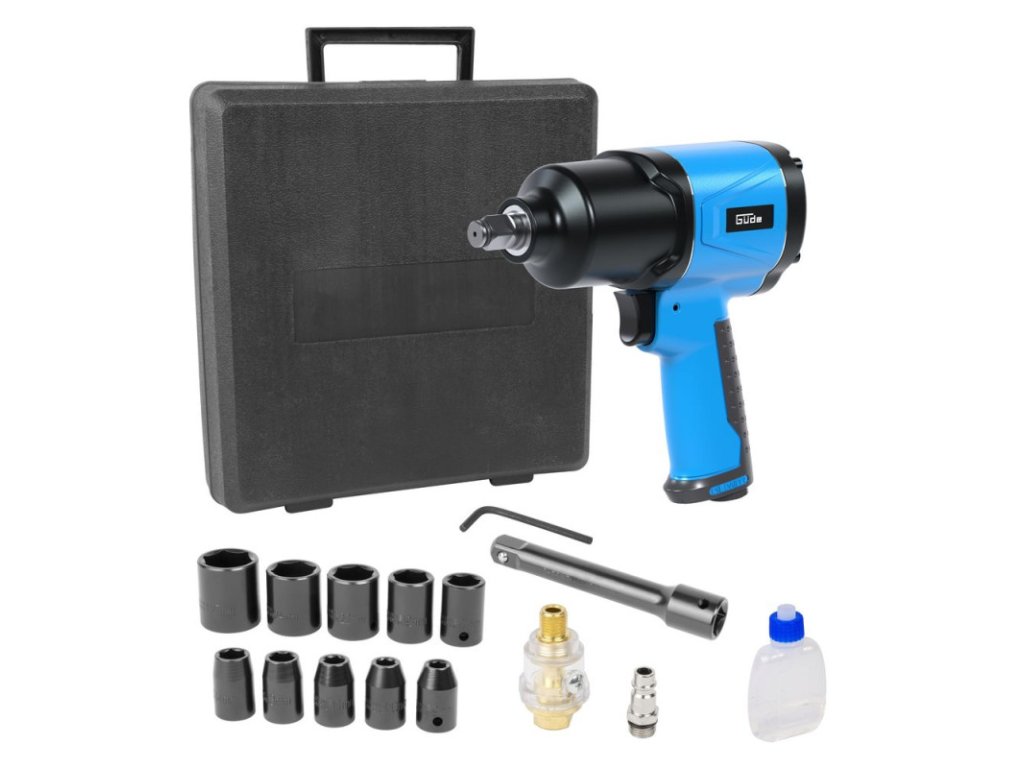 Pneumatický rázový uťahovák s príslušenstvom je nevyhnutnou výbavou každého domáceho majstra aj remeselníka, najmä pri výmene pneumatík na automobile. Ergonomicky tvarovaný skrutkovač s mäkkou rukoväťou sa pohodlne a bezpečne drží v ruke a vďaka nízkej hmotnosti umožňuje prácu bez únavy. Vysokoúčinný valčekový rázový mechanizmus vytvára uvoľňovací moment až 580 Nm, a to aj pri nízkej potrebe vzduchu 204 litrov za minútu. Problémom tak nie sú ani mimoriadne utiahnuté skrutky. Rozsiahle príslušenstvo je prehľadne uložené v praktickom kufríku na prenášanie a je v ňom všetko, čo potrebujete na to, aby ste sa okamžite pustili do práce. Teleso z ľahkého hliníkového tlakového odliatku. Vysokoúčinný valčekový rázový mechanizmus. Štvornásobné nastavenie krútiaceho momentu, pravý/ľavý chod. Pneumatická pripojovacia vsuvka, predĺženie, 10 nástrčkových kľúčov veľkosti: 9, 10, 11, 13, 14, 17, 19, 22, 24, 27 mm, fľaška na olej, mini olejnička na hmlu, inbusový kľúč. Praktický úložný kufrík.