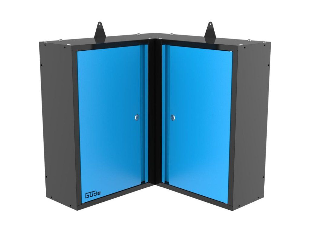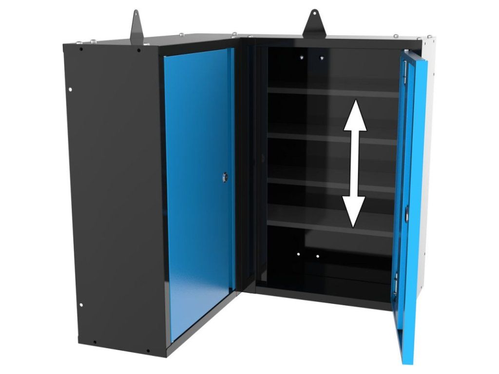 Dvojdverová rohová závesná skrinka je súčasťou dômyselného a veľmi jednoduchého doplnku Eco Line. Vyrobená na mieru umožňuje optimálne využitie rohu miestnosti – predovšetkým v kombinácii so zodpovedajúcou súpravou perforovaných stien a rohovou doskou na spojenie dvoch pracovných stolov. Takto jednoducho premeníte často nevyužitý priestor na ďalšiu pracovnú a úložnú plochu. Oceľový plech s práškovou povrchovou úpravou, 2 police, 2 samostatne uzamykateľné dvierka. Dodáva sa v nezmontovanom stave.