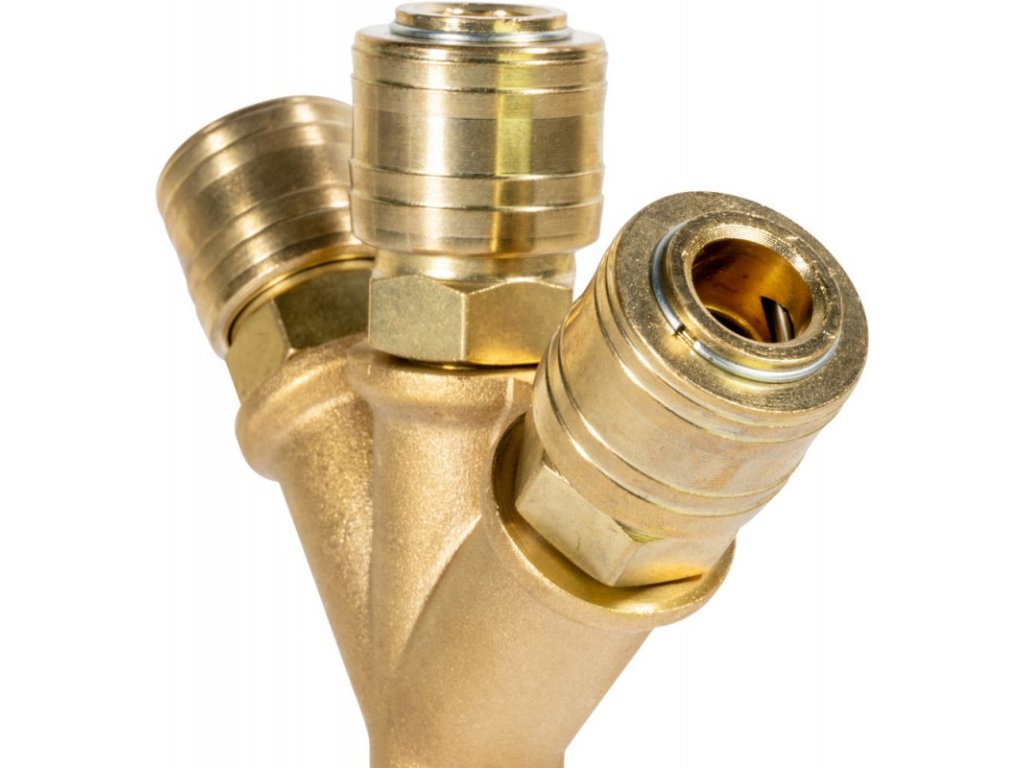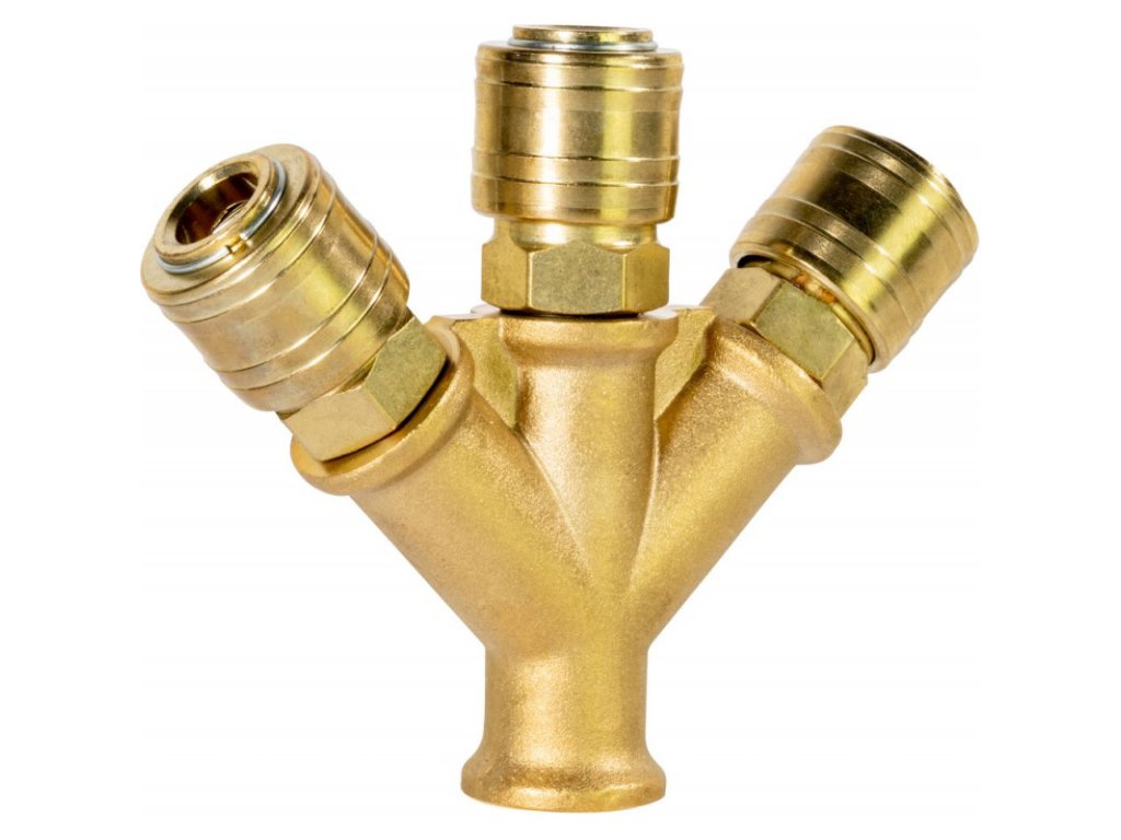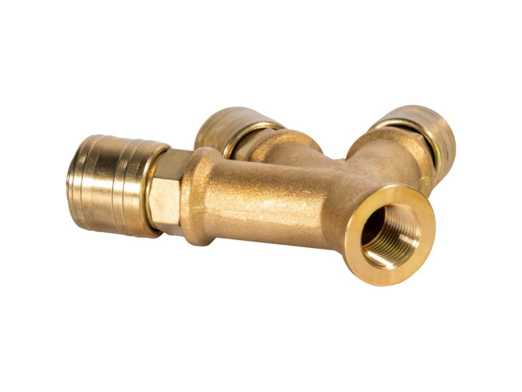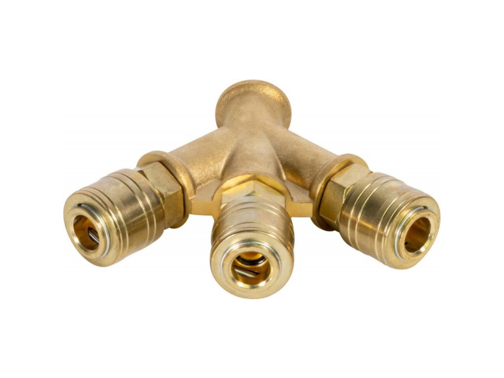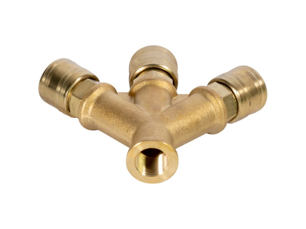 Mosadzný rozdeľovač s tromi spojkami. V balení 1 ks.