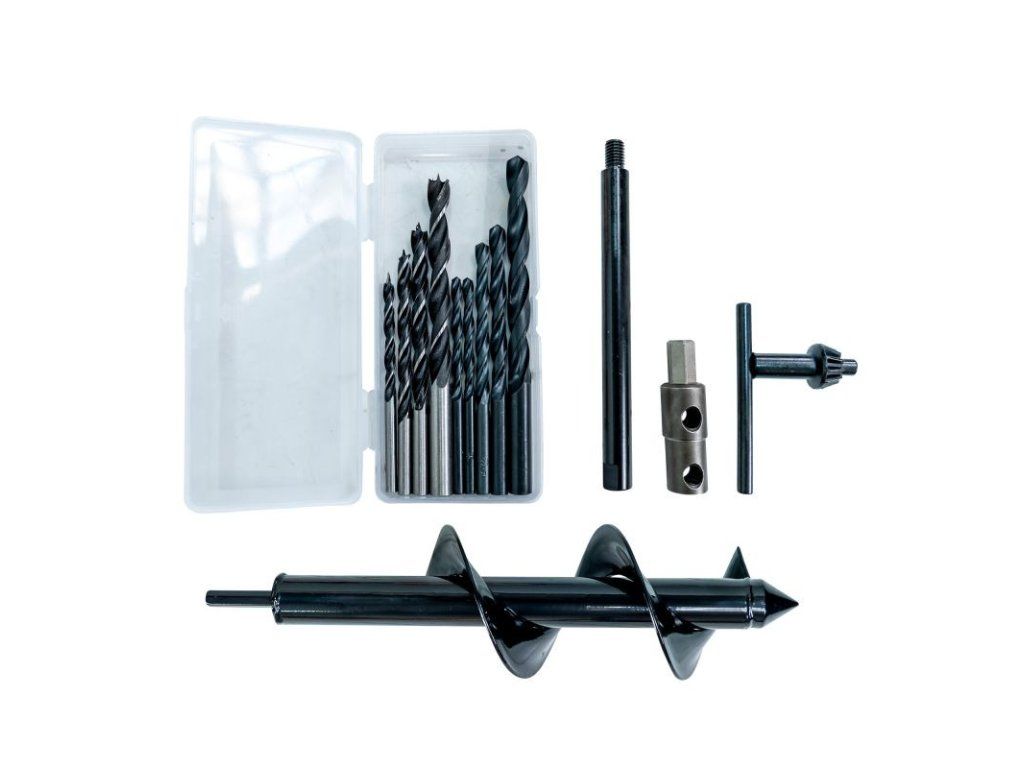 Dodávaná súprava vrtákov obsahuje zemný vrták s rozmermi 80 x 300 mm, ktorý je ideálny na vŕtanie otvorov do zeme, čím uľahčuje prácu v záhrade alebo po inštalácii.