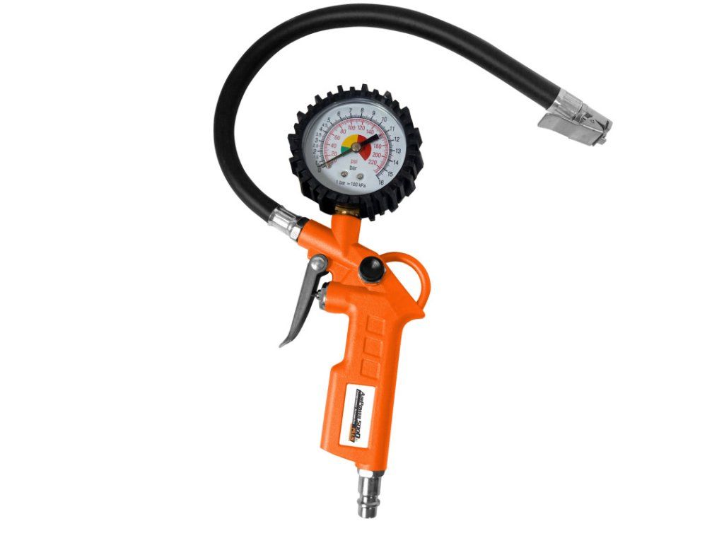 • Plniaca pištoľ s manometrom sa používa na hustenie a reguláciu tlaku pneumatík, lodí a nafukovacích matracov. Je vybavená odvzdušňovacím ventilom.