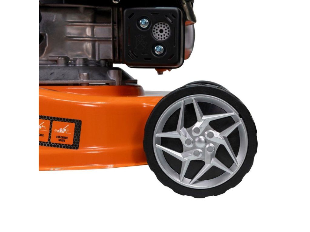 Veľký priemer kolies (15 cm vpredu / 15 cm vzadu) umožňuje kosiť trávnik aj v oblastiach so sklonom až 15 stupňov.