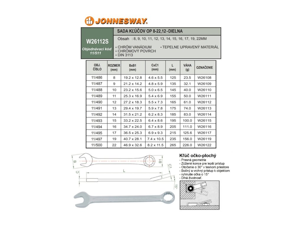 -12 ks OP kľúčov: 8, 9, 10, 11, 12, 13, 14, 15, 16, 17, 19, 22 mm