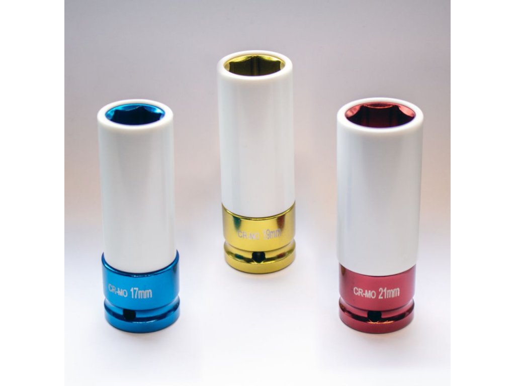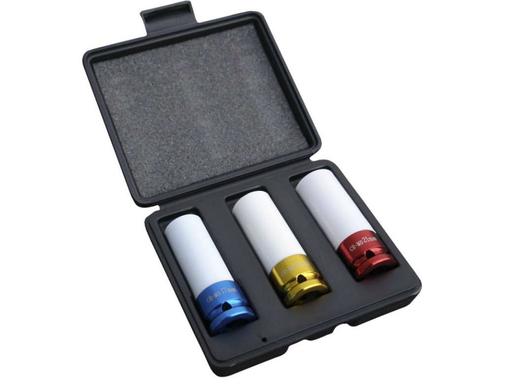 Dlhé nástrčkové kľúče na skrutky kolies, plastová vložka na ochranu povrchu disku. V praktickom boxe na uskladnenie. Vhodné k Rázovému uťahováku DL 1/2" PRO (kód tovaru: 75130), Pneumatickej račni 1/2" PRO (kód tovaru: 75140), Račňovému kľúču Combi PRO (kód tovaru: 75145), Rázovému uťahováku ESS 350 (kód tovaru: 58120), Aku rázovému uťahováku BSS 18 1/2" (kód tovaru: 58506).