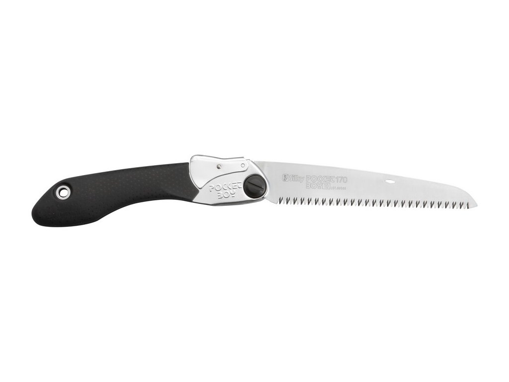 Pocketboy 170-10 Jedná se o mimořádně kompaktní lehkou skládací pilku s ostrým pilovým listem, která zabírá velmi málo místa ve vaší kapse či batohu. Tato multifunkční prořezávací pila je ideální pro všechny druhy prořezávacích činností na Vaší zahradě. Nenechte se však zmást velikostí Pocketboye. Tato malá pila poskytuje skvělý výkon! A protože se Pocketboy snadno vejde do kapsy či batohu, můžete mít tuto pilu vždy po ruce. Součástí balení je navíc i průhledné plastové flip-lock pouzdro s klipem na opasek. Vlastnosti Pevný 170 mm pilový list s prořezem 1,4 mm je plně odolný proti venkovním podmínkám. Čepel je osazena středně agresivními zuby ostrými jako břitva, díky kterým nebudete mít problém přeříznout i větve o průměru až 8 cm. Pilu lze jednoduše složit a rozložit pomocí aretačního tlačítka, které zároveň dovoluje uživateli nastavit 2 různé polohy řezání. Gumová rukojeť pak tlumí vibrace a zajišťuje bezpečný a pohodlný úchop. Pro větší praktičnost je v rukojeti přítomen otvor, který umožňuje k pile připevnit karabinu nebo lano. Při plném složení se ostří pily bezpečně schová do rukojeti. Nemusíte se tak bát, že byste se zranili nebo pilku otupily. Série Pocketboy 170 Série skládacích pil Pocketboy 170 představuje sérii kompaktních pilek s velkým řezným výkonem. Tyto malé lehké pomocníky oceníce nejen na svých cestách divočinou, ale i na zahradě při prořezávání stromků s husotu korunou. Firma Silky moc dobře ví, že různé situace vyžadují různé způsoby řešení a tak jsou pily série Pocketboy dodávány ve čtyřech barevně rozlišených provedeních: Žlutá - Pocketboy Curve 170-8 ( zahnutá čepel; velmi agresivní záběr; 8 zubů na 30 mm ) Červená - Pocketboy 170-8 ( rovná čepel; velmi agresivní záběr; 8 zubů na 30 mm ) Černá - Pocketboy 170-10 ( rovná čepel; středně agresivní záběr; 10 zubů na 30 mm ) Modrá - Pocketboy 170-20 ( rovná čepel; velmi jemný záběr; 20 zubů na 30 mm ) Všechny čepele jsou však mezi pilami navzájem vyměnitelné. Je tak možné si dokoupit pouze samotnou čepel, plochým šroubovákem povolit hlavní pojistý šroub a nakonfigurovat si pilu pro aktuální typ použití. Údržba pily Pro zachování účinnosti je nutné udržovat čepel v čistotě. Pokud je tedy ostří zalepeno pryskyřicí, či mízou, použijte k čištění olivový olej. Jedná se o účinný a ekologický způsob, jak rozpustit tyto nečisoty. Pokud pilu déle nepoužíváte, dbejte na to, aby byla vždy suchá.Dodatočné parametre