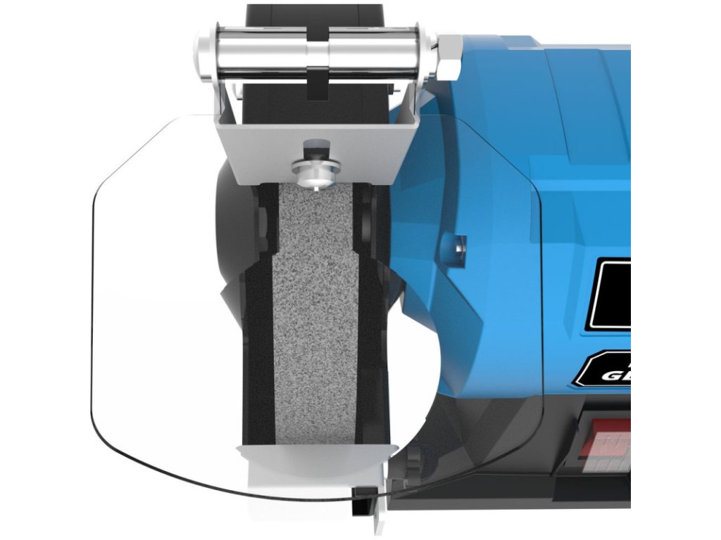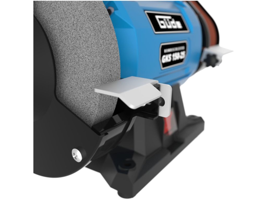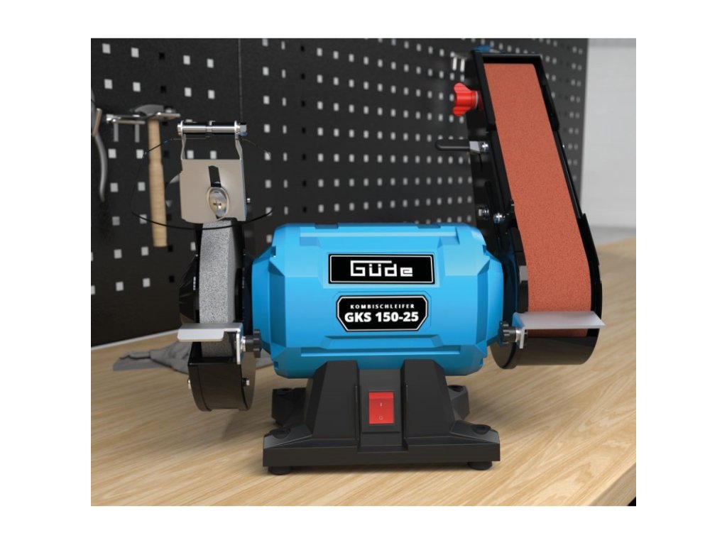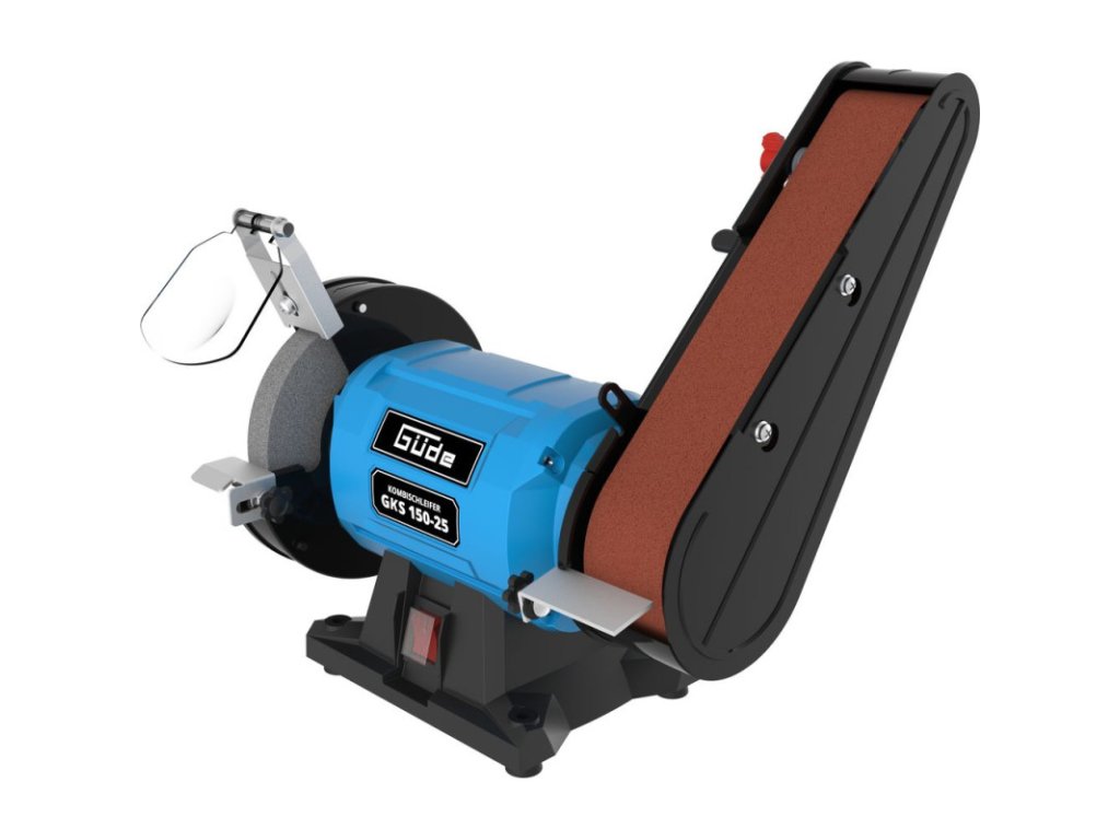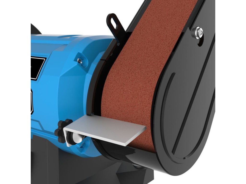 Kombinovaná brúska s kondenzátorovým motorom, stabilné umiestnenie stroja, pokojný chod bez vibrácií, brúsne osky v guľôčkových ložiskách, prestaviteľné pracovné opierky, s ochranným krytom proti iskrám. Zrnitosť kotúča na jemné brúsenie 36, zrnitosť brúsneho pásu 80.