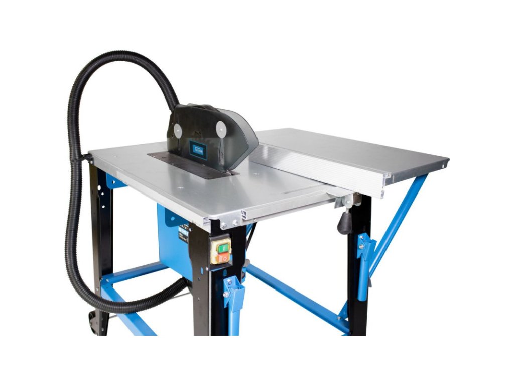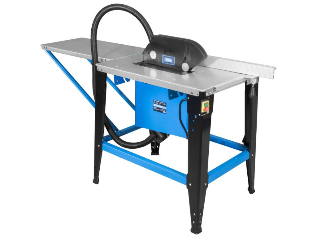 Stolová píla s pozinkovaným pracovným stolom, pozdĺžnym a uhlovým dorazom. Nastavenie výšky pílového kotúča pomocou kľuky, pílový kotúč možno sklopiť o 90° - 45°, pripojenie pre odsávací systém. Prepravné kolesá, riadiaca rukoväť, odnímateľný nadstavec na stôl, 1x pílový kotúč HM.