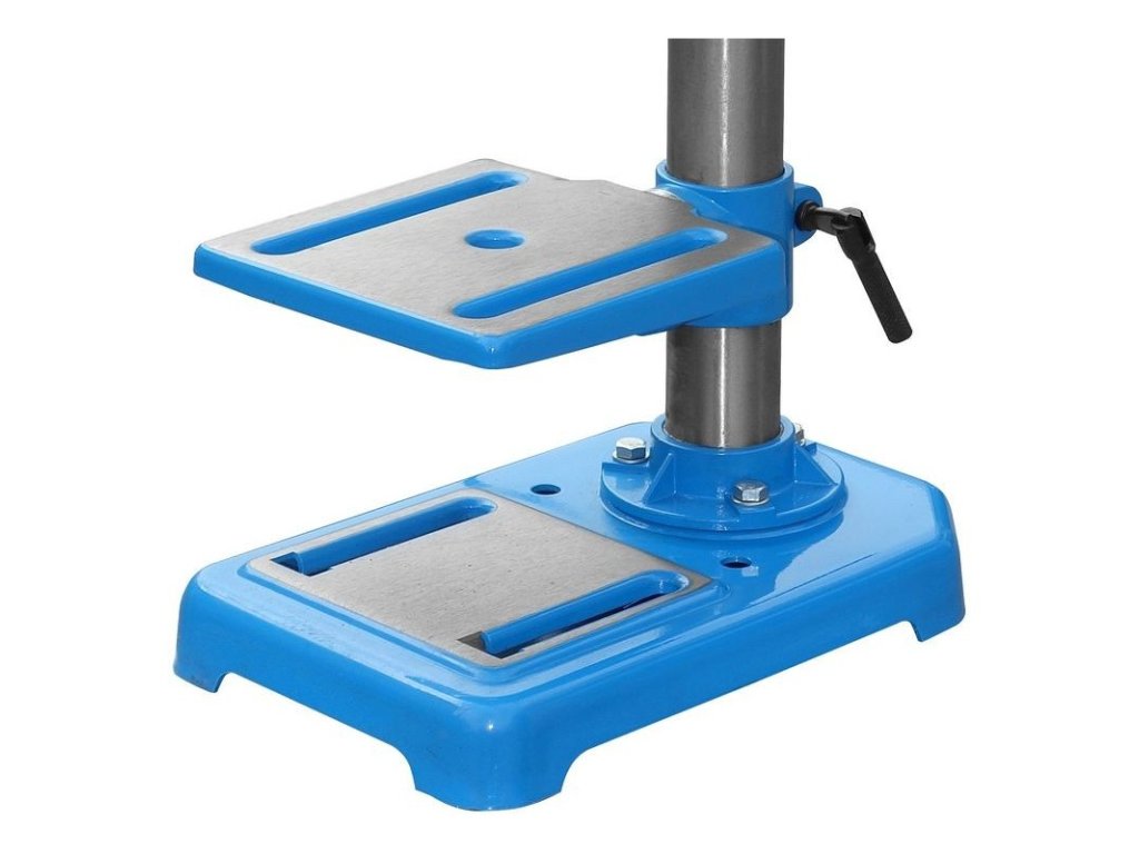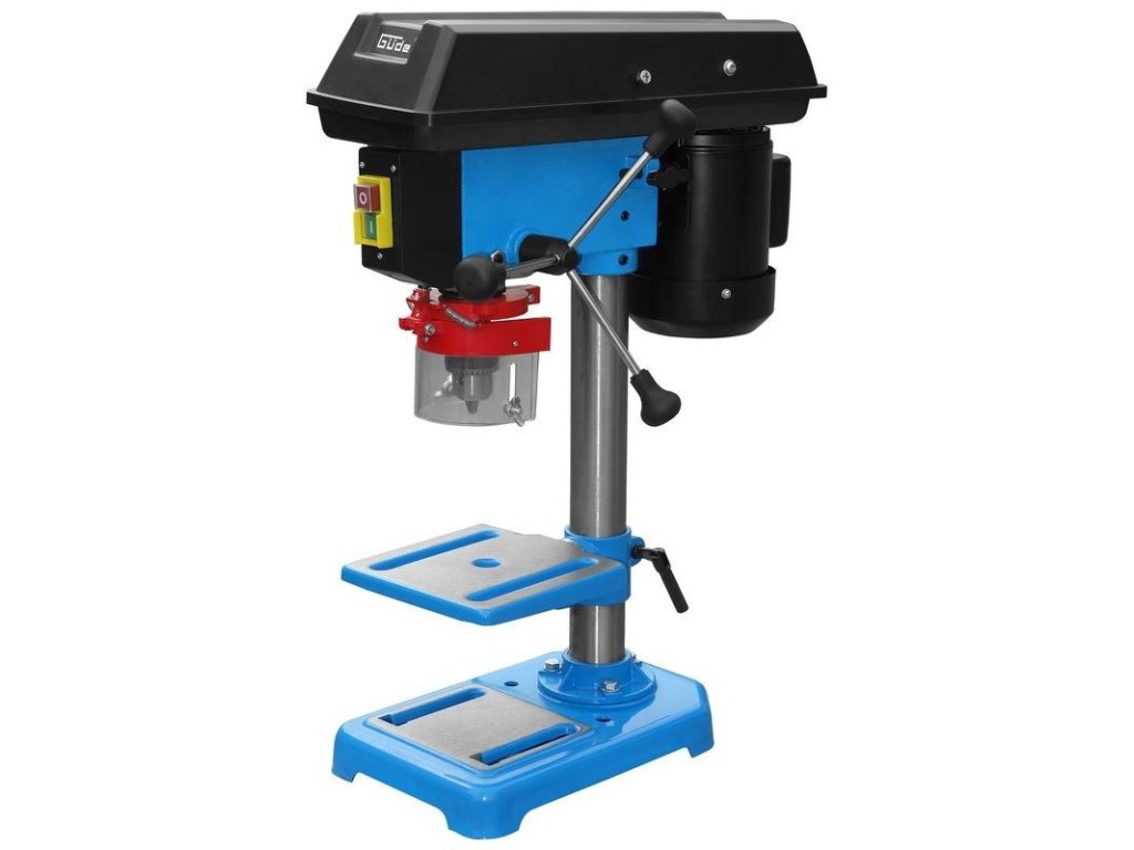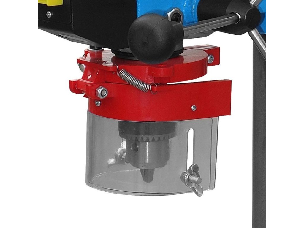 Stolová vŕtačka s pohonom klinovým remeňom, nastavenie rýchlosti pomocou stupňovitej remenice. Systém napínania klinového remeňa. Vŕtacie vreteno uložené v guľôčkových ložiskách. Vypínač so spínačom nulového napätia. Sklápacia ochrana proti pilinám. Vŕtací stôl výškovo nastaviteľný, sklopný o +/- 45° a otočný o 360°. Nastaviteľný hĺbkový doraz vŕtania pre presné vŕtanie.
