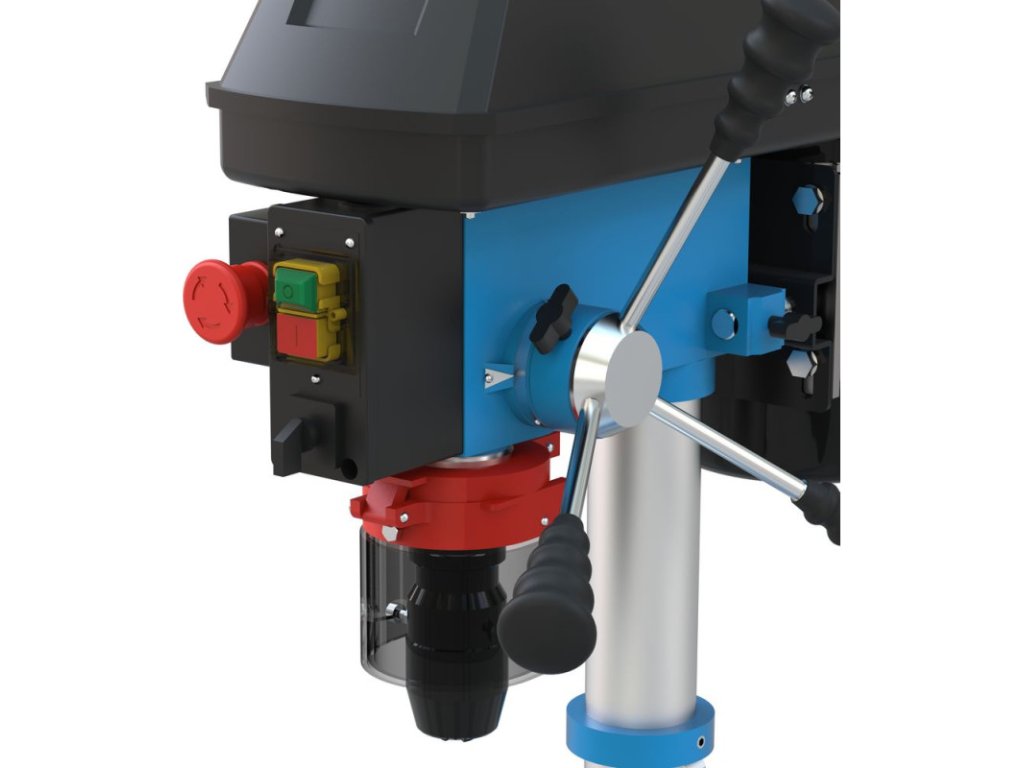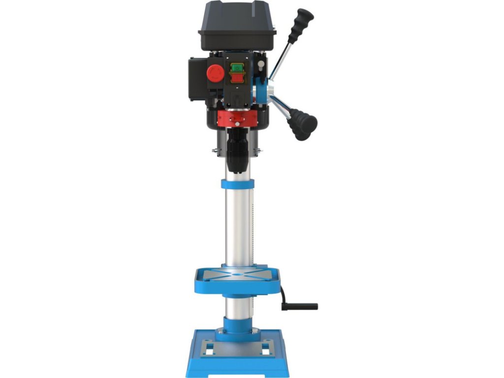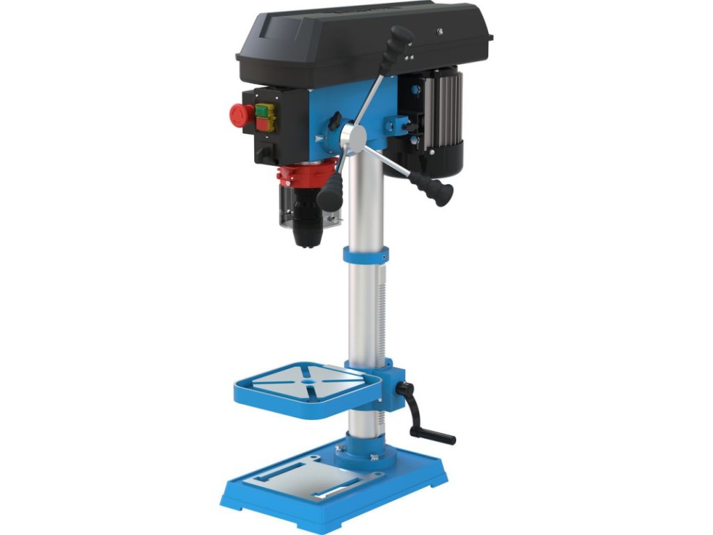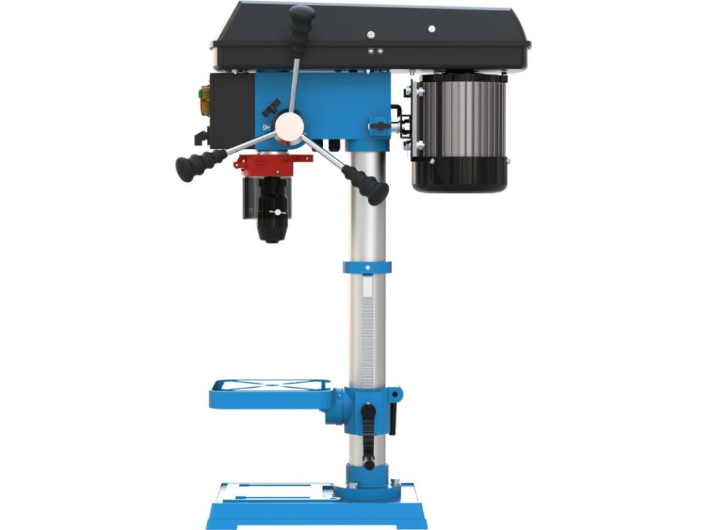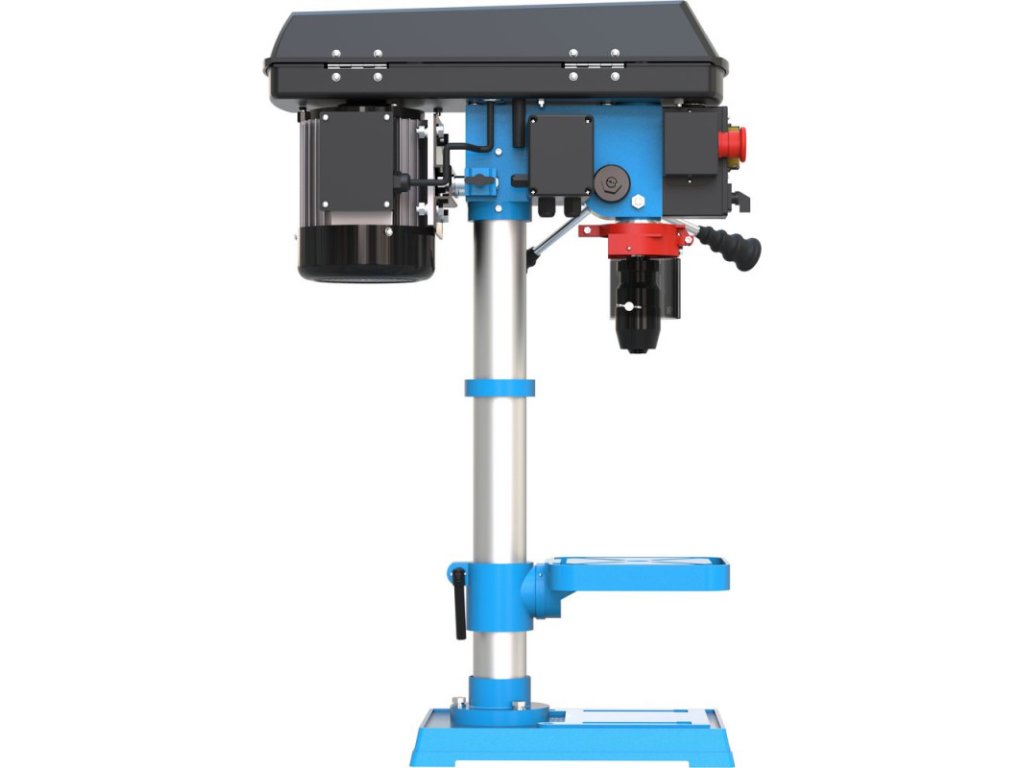Stolová vŕtačka s pohonom klinovým remeňom, nastavenie rýchlosti pomocou stupňovitej remenice. Systém napínania klinového remeňa. Vŕtacie vreteno uložené v guľôčkových ložiskách. Vypínač so spínačom nulového napätia. Pravý / ľavý chod. Sklápacia ochrana proti pilinám. Vŕtací stôl výškovo nastaviteľný, sklopný o +/- 45° a otočný o 360°, s odtokovými kanálikmi na chladiacu kvapalinu. Nastaviteľný hĺbkový doraz vŕtania pre presné vŕtanie.