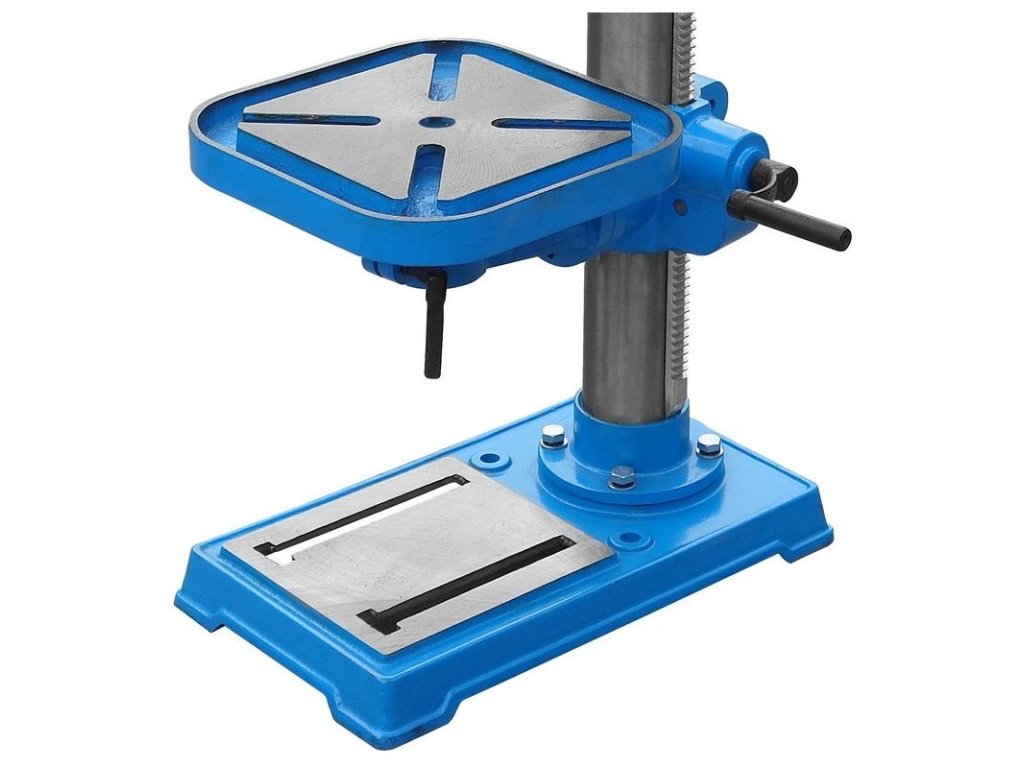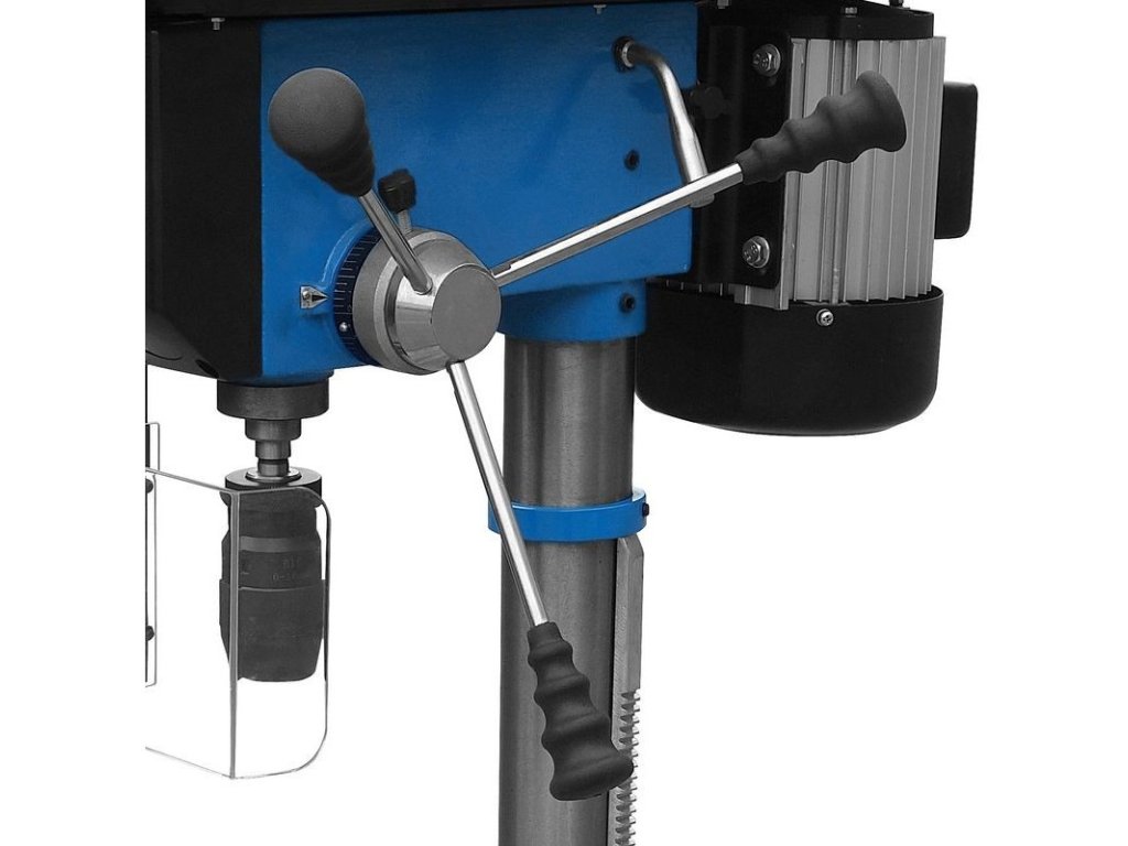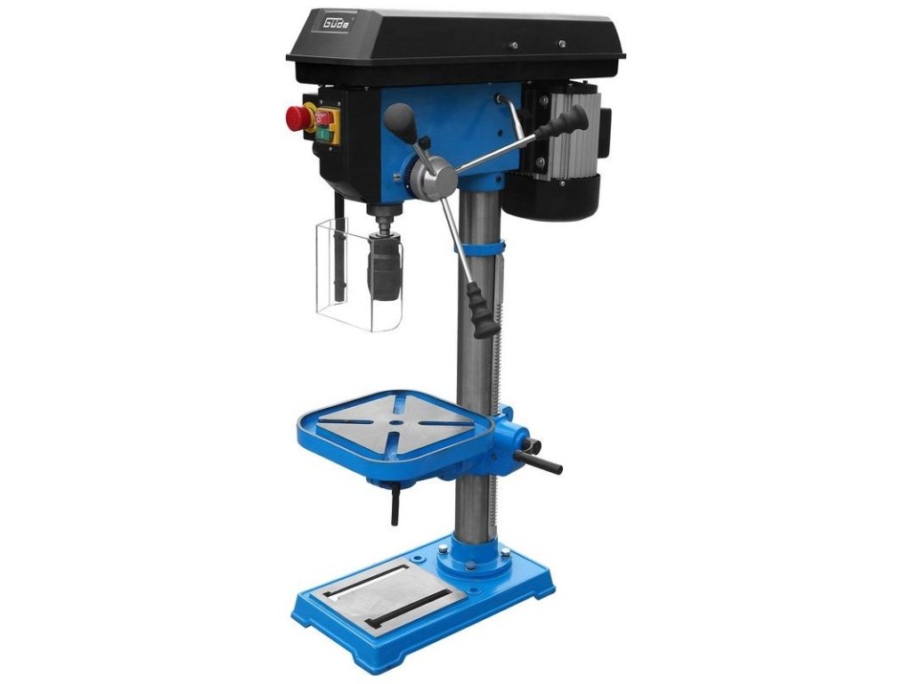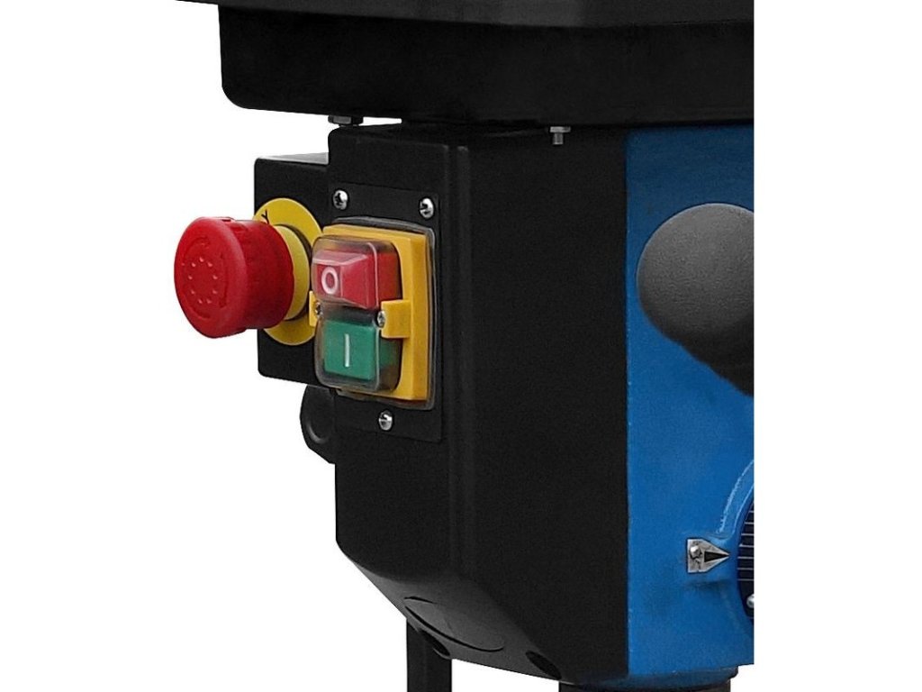 Stolová vŕtačka s pohonom klinovým remeňom, nastavenie rýchlosti pomocou stupňovitej remenice. Systém napínania klinového remeňa. Vŕtacie vreteno uložené v guľôčkových ložiskách. Vypínač so spínačom nulového napätia. Núdzový vypínač. Sklápacia ochrana proti pilinám s mikrospínačom. Vŕtací stôl výškovo nastaviteľný, sklopný o +/- 45° a otočný o 360°, s odtokovými kanálmi pre chladiacu kvapalinu. Nastaviteľný hĺbkový doraz vŕtania pre presné vŕtanie.