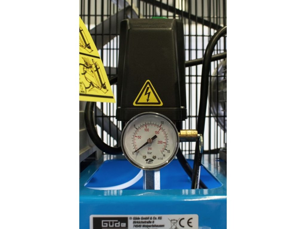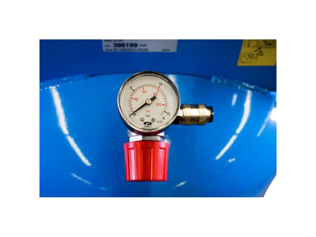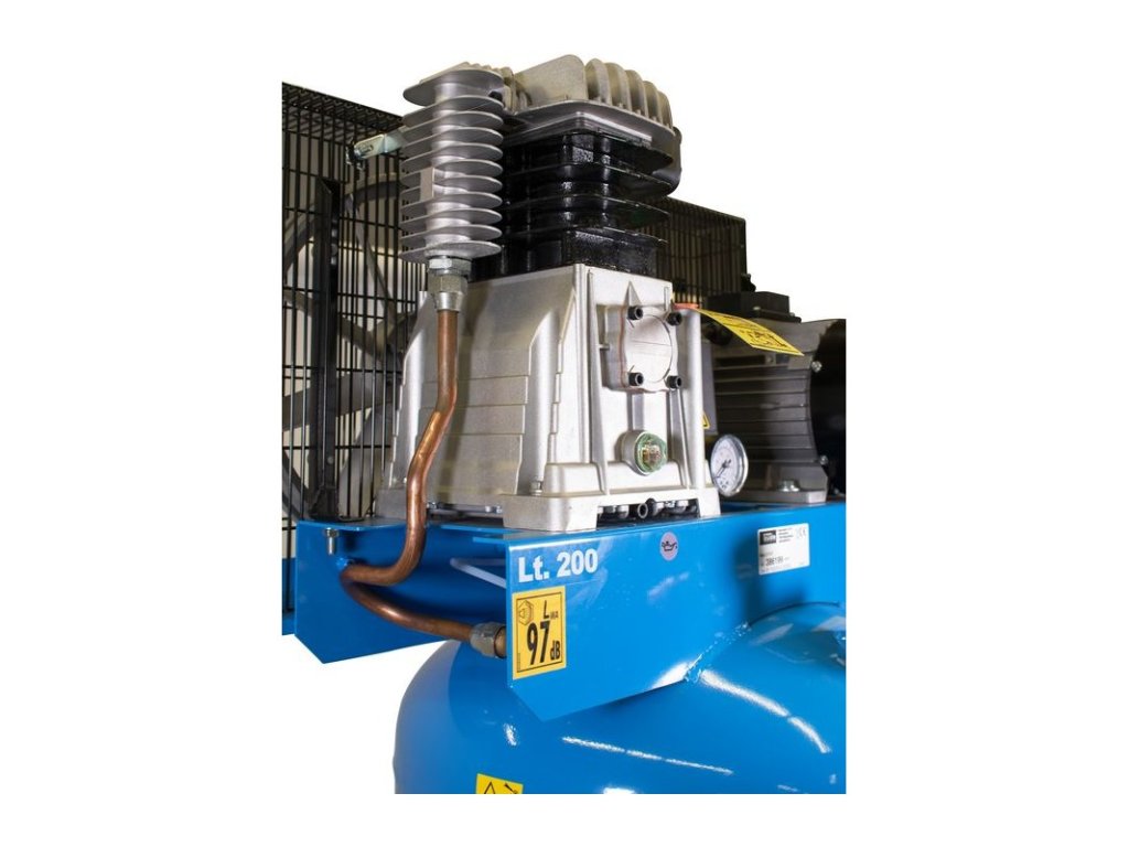Stacionárny dvojpiestový kompresor s olejovým mazaním, s remeňovým pohonom. Tlakový spínač s integrovanou ochranou motora, manometer tlaku vo vzdušníku a manometer pracovného tlaku, 2 spojky na stlačený vzduch, chladič, redukčný ventil, poistný ventil, vypúšťací ventil na kondenzát. Pretlakový ventil, vzduchový filter.