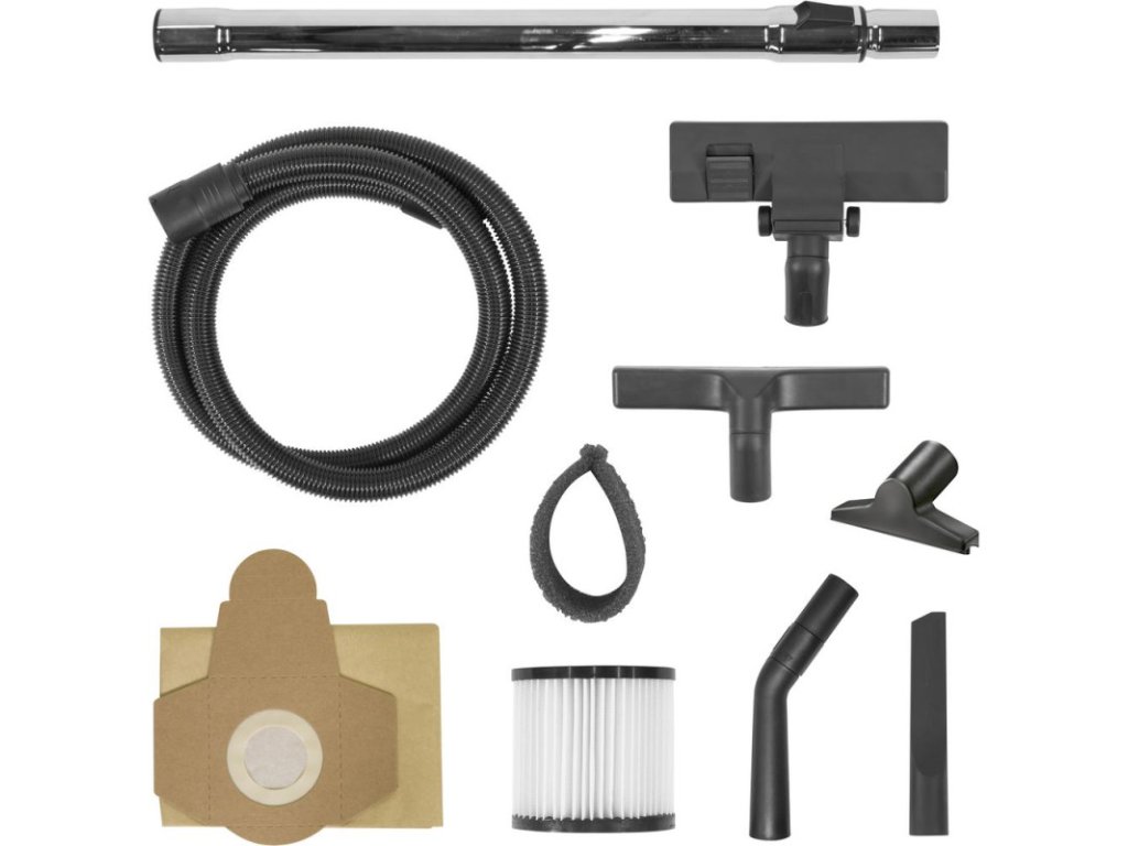 Vysávač s nehrdzavejúcou nádobou z ušľachtilej ocele s vypúšťaním špinavej vody, prídavná zástrčka, robustná teleskopická rúra, plynule regulovateľný prúd vzduchu, integrovaný držiak na príslušenstvo, 4 otočné kolieska. Príslušenstvo: sacia hadica 3 m, rukoväť s pripojením vzduchu, teleskopická sacia rúra (94 cm), 1 podlahová hubica, 1 hubica na koberce, penový filter, 1 papierové filtračné vrecko.