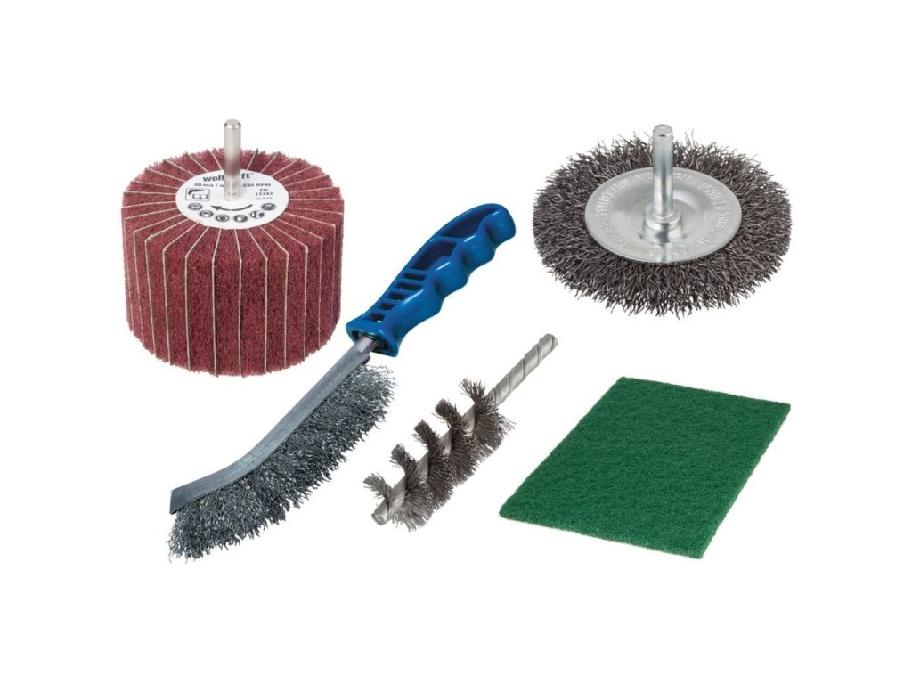 Spracovanie kovových predmetov v exteriéri. obsahuje: 1x ručná drôtenú kefu, pre hrubé predčistenie, 125 mm 1x drôtený kotúčový kefa, priemer 75 mm, na odstránenie korózie a farby z povrchov 1x valcovitý drôtený kotúč, priemer 28 mm, na odstránenie korózie a farby z rohov 1x vejárový mop, priemer 80 mm, na odstránenie nečistôt 1x hubka z brúsnej plsti, pre záverečné jemné spracovanie, 115 x 75 mm Balenie: Dvojitá karta s vloženým blistromDodatočné parametre
